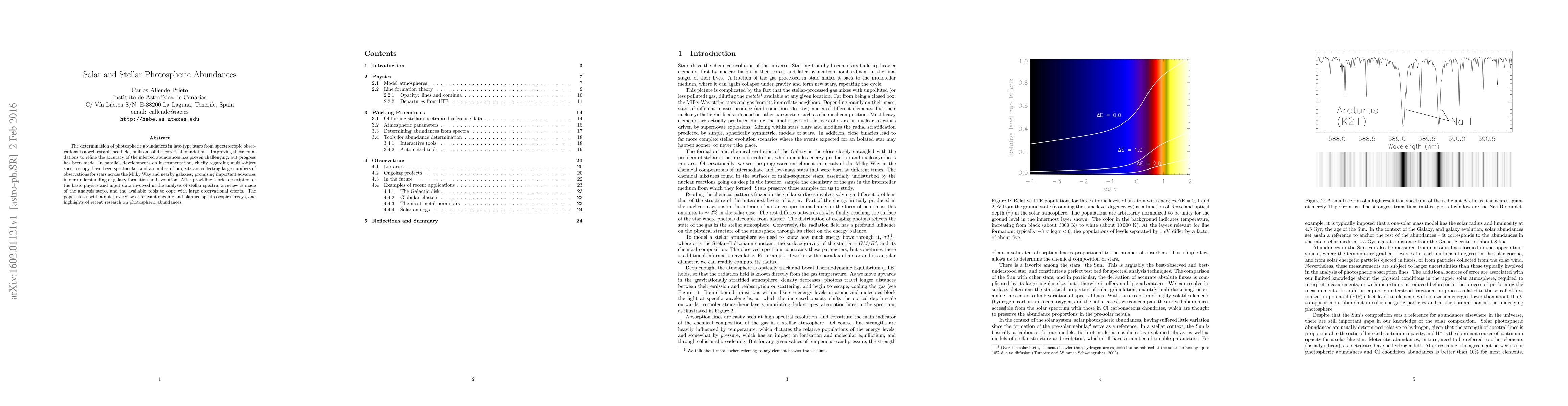The determination of photospheric abundances in late-type stars from spectroscopic observations is a well-established field, built on solid theoretical foundations. Improving those foundations to refine the accuracy of the inferred abundances has proven challenging, but progress has been made. In parallel, developments on instrumentation, chiefly regarding multi-object spectroscopy, have been spectacular, and a number of projects are collecting large numbers of observations for stars across the Milky Way and nearby galaxies, promising important advances in our understanding of galaxy formation and evolution. After providing a brief description of the basic physics and input data involved in the analysis of stellar spectra, a review is made of the analysis steps, and the available tools to cope with large observational efforts. The paper closes with a quick overview of relevant ongoing and planned spectroscopic surveys, and highlights of recent research on photospheric abundances.