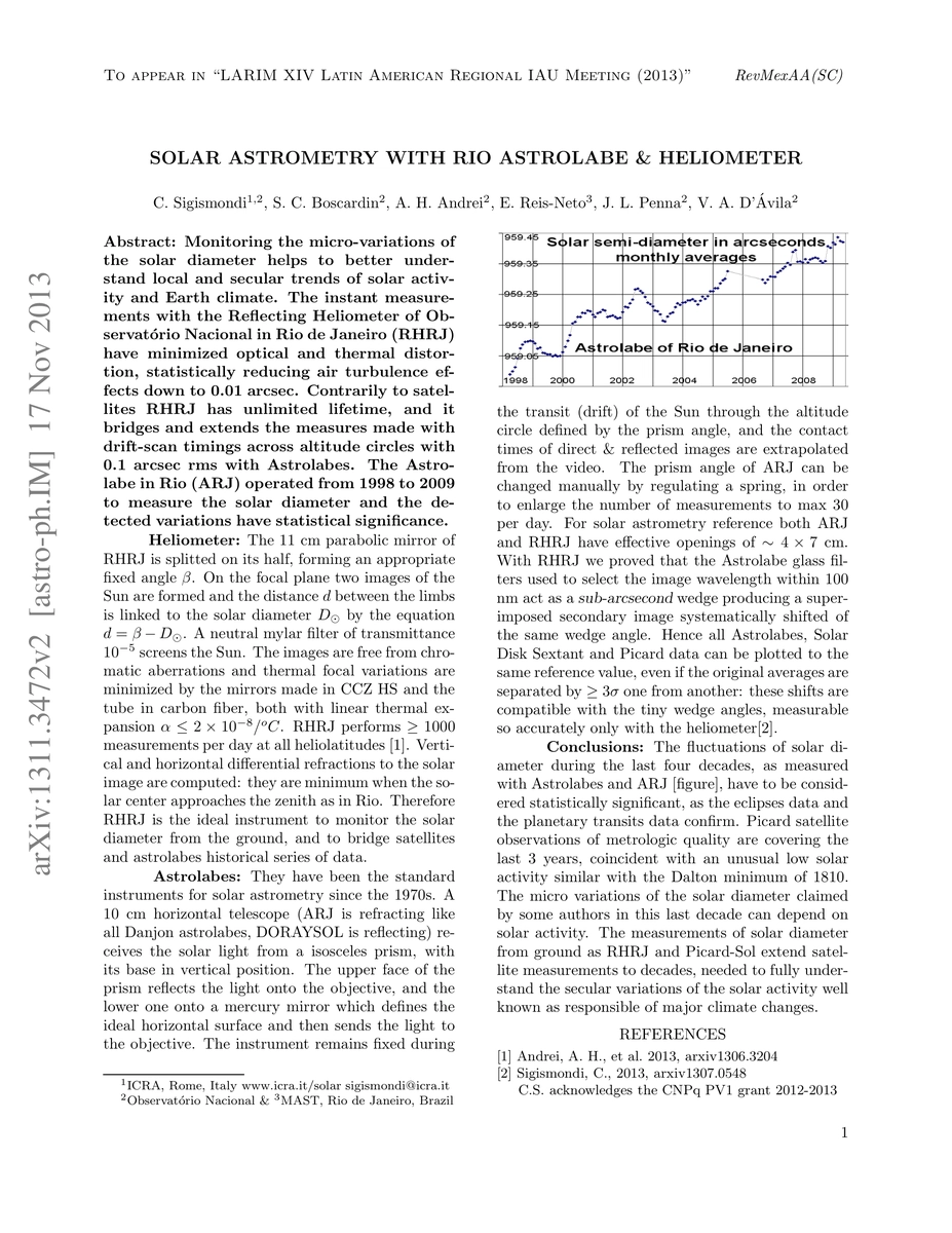 Monitoring the micro-variations of the solar diameter helps to better understand local and secular trends of solar activity and Earth climate. The instant measurements with the Reflecting Heliometer of Observatorio Nacional in Rio de Janeiro have minimized optical and thermal distortion, statistically reducing air turbulence effects down to 0.01 arcsec. Contrarily to satellites RHRJ has unlimited lifetime, and it bridges and extends the measures made with drift-scan timings across altitude circles with 0.1 arcsec rms with Astrolabes. The Astrolabe in Rio operated from 1998 to 2009 to measure the solar diameter and the detected variations have statistical significance.