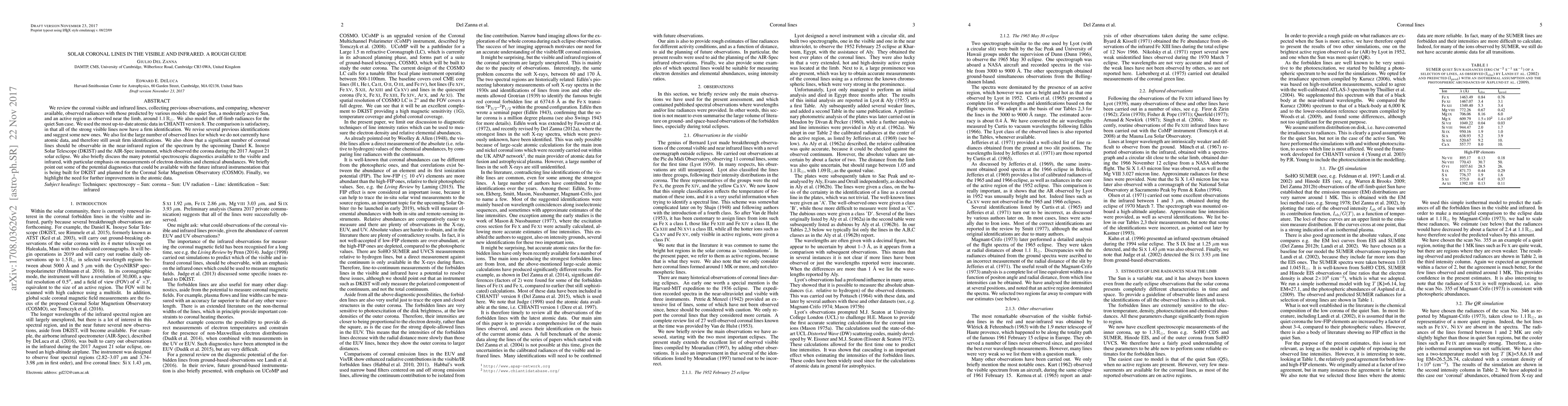 We review the coronal visible and infrared lines, collecting previous observations, and comparing, whenever available, observed radiances with those predicted by various models: the quiet Sun, a moderately active Sun, and an active region as observed near the limb, around 1.1R$_{\odot}$. We also model the off-limb radiances for the quiet Sun case. We used the most up-to-date atomic data in CHIANTI version 8. The comparison is satisfactory, in that all of the strong visible lines now have a firm identification. We revise several previous identifications and suggest some new ones. We also list the large number of observed lines for which we do not currently have atomic data, and therefore still await firm identifications. We also show that a significant number of coronal lines should be observable in the near-infrared region of the spectrum by the upcoming Daniel K. Inouye Solar Telescope (DKIST) and the AIR-Spec instrument, which observed the corona during the 2017 August 21 solar eclipse. We also briefly discuss the many potential spectroscopic diagnostics available to the visible and infrared, with particular emphasis on measurements of electron densities and chemical abundances. We briefly point out some of the potential diagnostics that could be available with the future infrared instrumentation that is being built for DKIST and planned for the Coronal Solar Magnetism Observatory (COSMO). Finally, we highlight the need for further improvements in the atomic data.