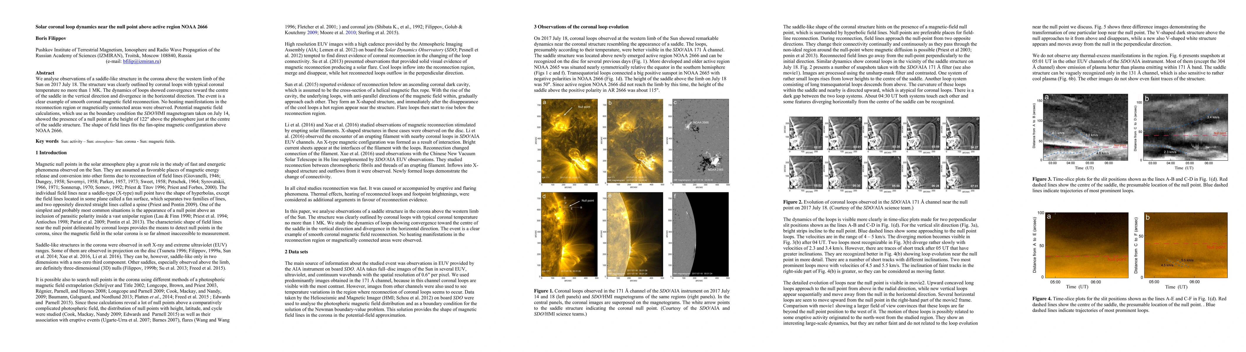 The paper examines a saddle-like solar coronal structure above active region NOAA 2666 on July 18, 2017, using loop dynamics and potential magnetic field calculations. Smooth magnetic reconnection is identified without heating, supported by a null point at 122" above the photosphere, fitting the fan-spine configuration.