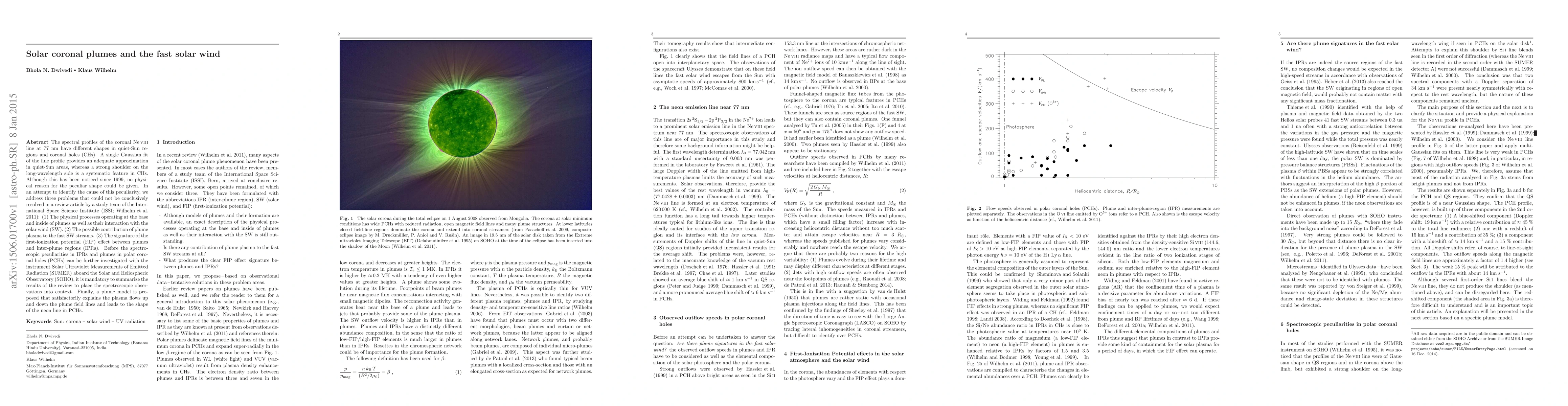 The study investigates solar coronal plumes and their potential contribution to fast solar wind streams using spectral profiles of Ne VIII lines at 77 nm, comparing quiet Sun regions with coronal holes. It also examines the first-ionization potential (FIP) effect between plumes and inter-plume regions.