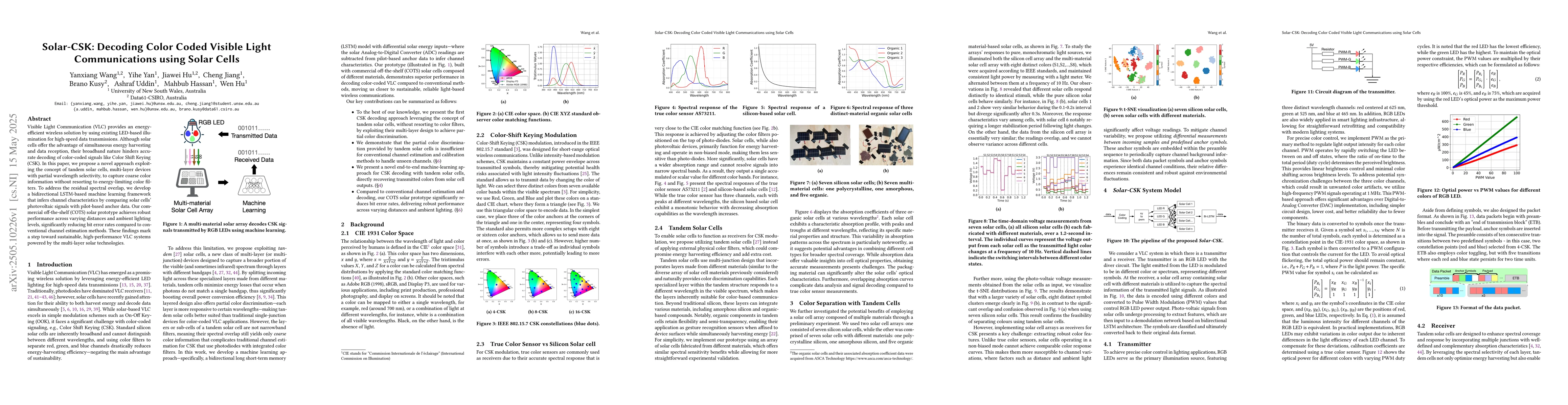 The research proposes a novel approach using tandem solar cells with partial wavelength selectivity to capture coarse color information for decoding color-coded visible light communication signals. A bidirectional LSTM-based machine learning framework is developed to infer channel characteristics by comparing solar cells' photovoltaic signals with pilot-based anchor data.