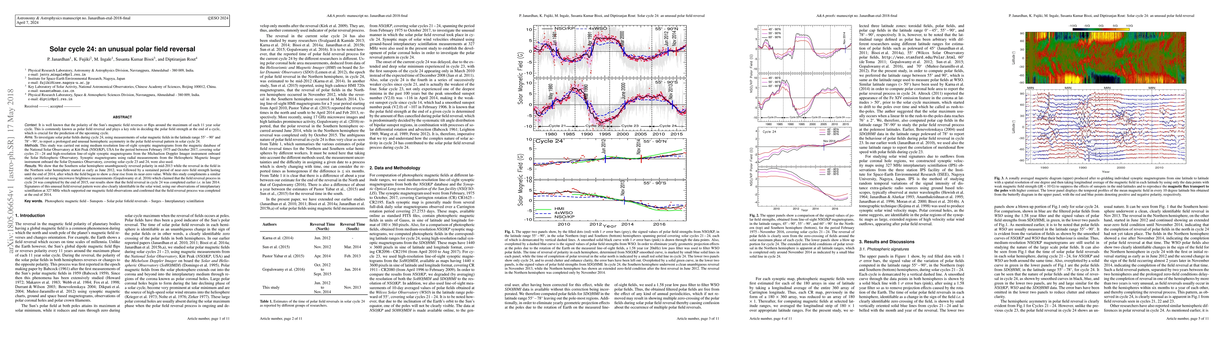 Aims: To investigate solar polar fields during cycle 24, using measurements of solar magnetic fields in the latitude range 55 - 90 degree and 78 - 90 degree, to report a prolonged and unusual hemispheric asymmetry in the polar field reversal pattern in solar cycle 24. Methods: This study was carried out using medium resolution line-of-sight synoptic magnetograms from the magnetic database of the National Solar Observatory at Kitt Peak (NSO/KP), USA for the period between February 1975 and October 2017, covering solar cycles 21-24 and high-resolution line-of-sight synoptic magnetograms from the Michaelson Doppler Imager instrument onboard the Solar Heliospheric Observatory. Synoptic magnetograms using radial measurements from the Heliospheric Magnetic Imager instrument onboard the Solar Dynamics Observatory, covering solar cycle 23 and 24, were also used. Results: We show that the Southern solar hemisphere unambiguously reversed polarity in mid-2013 while the reversal in the field in the Northern solar hemisphere started as early as June 2012, was followed by a sustained period of near-zero field strength lasting until the end of 2014, after which the field began to show a clear rise from its near-zero value. While this study compliments a similar study carried out using microwave brightness measurements (Gopalswamy et al. 2016) which claimed that the field reversal process in cycle 24 was completed by the end of 2015, our results show that the field reversal in cycle 24 was completed earlier i.e. in late 2014. Signatures of this unusual field reversal pattern were also clearly identifiable in the solar wind, using our observations of interplanetary scintillation at 327 MHz which supported our magnetic field observations and confirmed that the field reversal process was completed at the end of 2014.