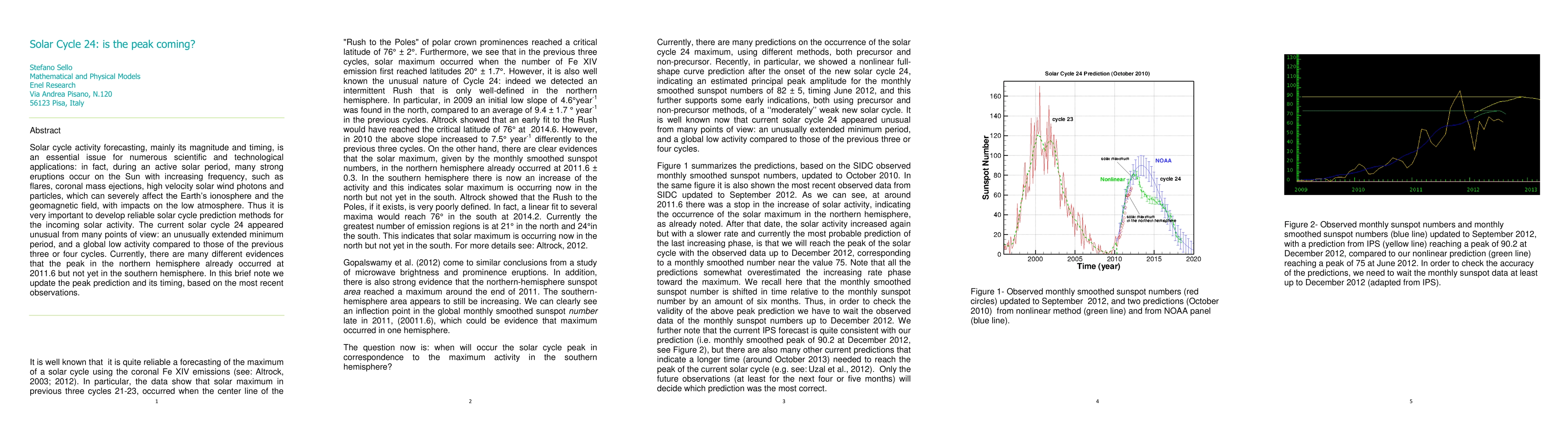 This paper discusses the forecasting of solar cycle 24's peak activity, noting its unusual extended minimum period and low global activity. It updates predictions based on recent observations, suggesting the peak in the northern hemisphere occurred in 2011.6, but not yet in the southern hemisphere.