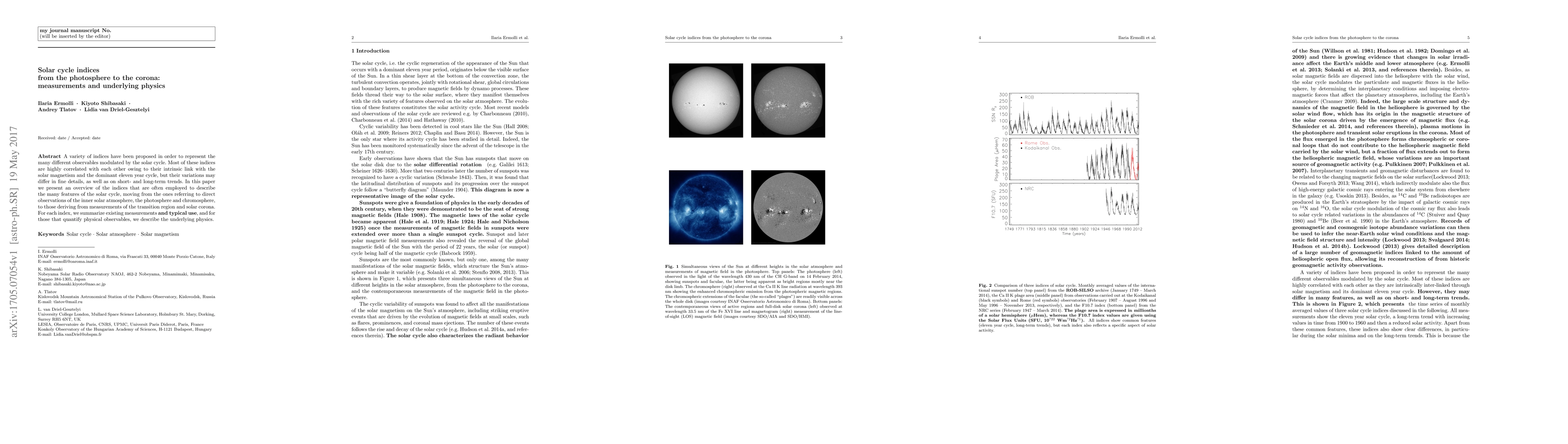 A variety of indices have been proposed in order to represent the many different observables modulated by the solar cycle. Most of these indices are highly correlated with each other owing to their intrinsic link with the solar magnetism and the dominant eleven year cycle, but their variations may differ in fine details, as well as on short- and long-term trends. In this paper we present an overview of the indices that are often employed to describe the many features of the solar cycle, moving from the ones referring to direct observations of the inner solar atmosphere, the photosphere and chromosphere, to those deriving from measurements of the transition region and solar corona. For each index, we summarize existing measurements {\bf and typical use}, and for those that quantify physical observables, we describe the underlying physics.