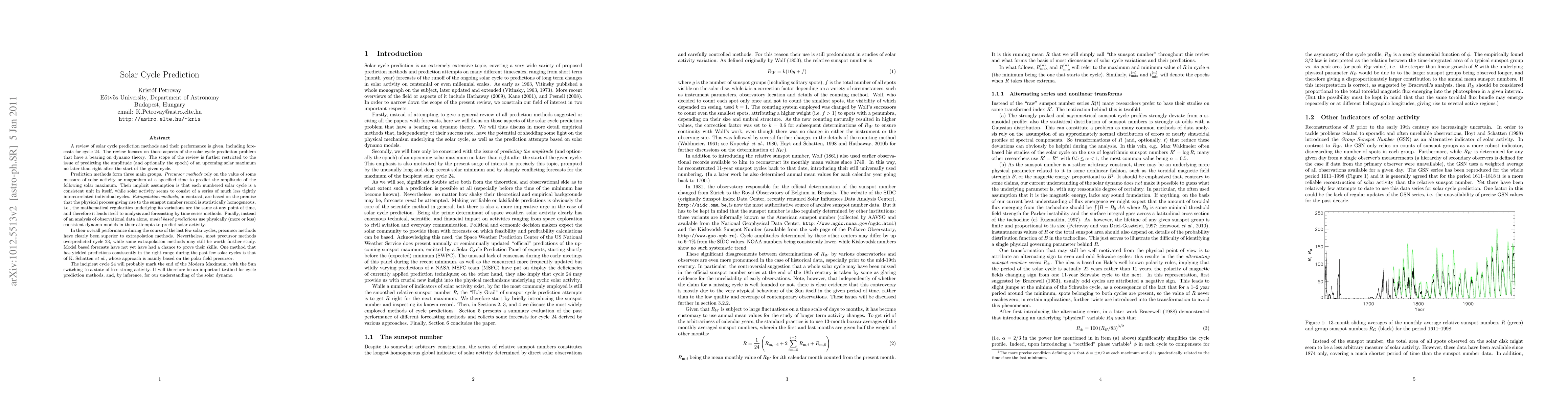 This paper reviews solar cycle prediction methods, categorizing them into precursor, extrapolation, and model-based approaches. Precursor methods have outperformed others historically, while model-based predictions remain untested. The paper forecasts a transition to lower solar activity with the onset of cycle 24.