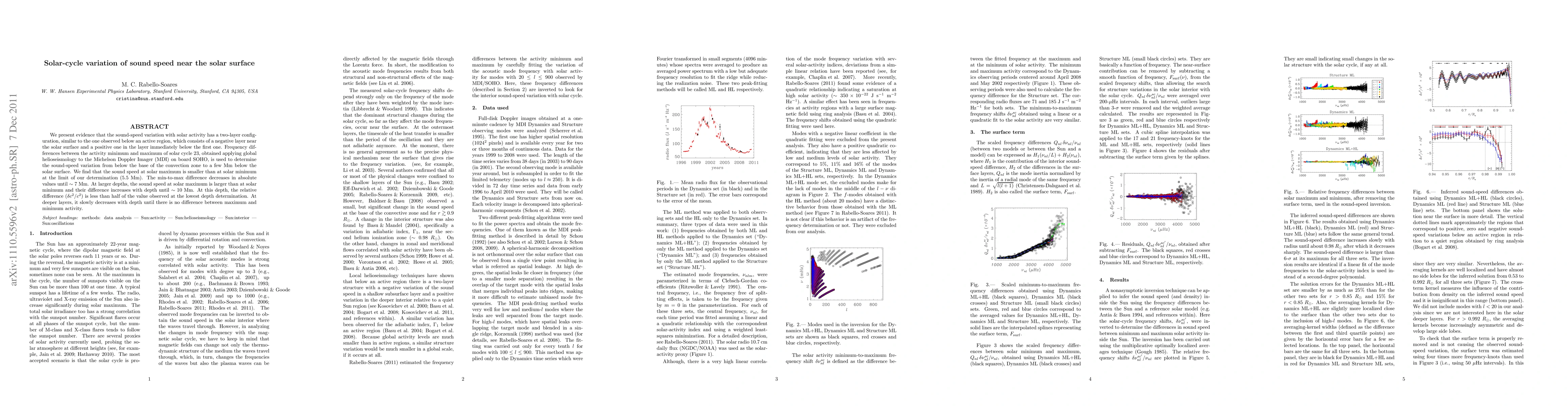 This paper reveals a two-layer solar sound-speed variation pattern with solar activity, showing a decrease near the surface and an increase below, determined through global helioseismology. The sound speed is lower at solar maximum near the surface but higher at deeper layers, with differences diminishing with depth.
