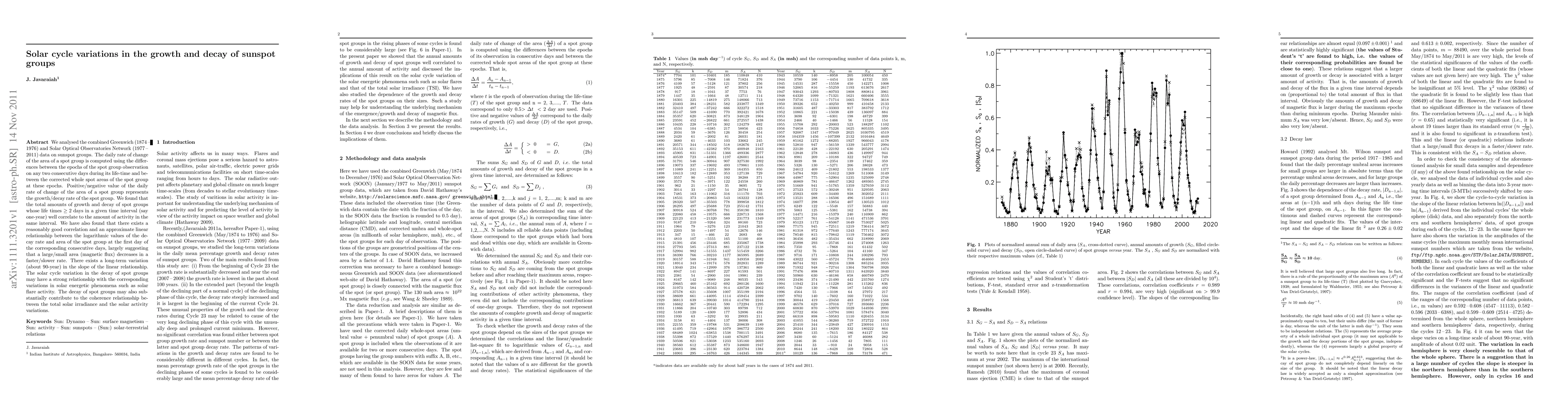 This study analyzes sunspot group growth and decay over solar cycles using historical data from Greenwich and Solar Optical Observatories. It finds a correlation between the total growth and decay rates of sunspot groups and solar activity levels, and a linear relationship between decay rate and initial area, suggesting larger areas decay faster. Long-term variations in decay rates hint at connections to solar energetic phenomena and total solar irradiance.