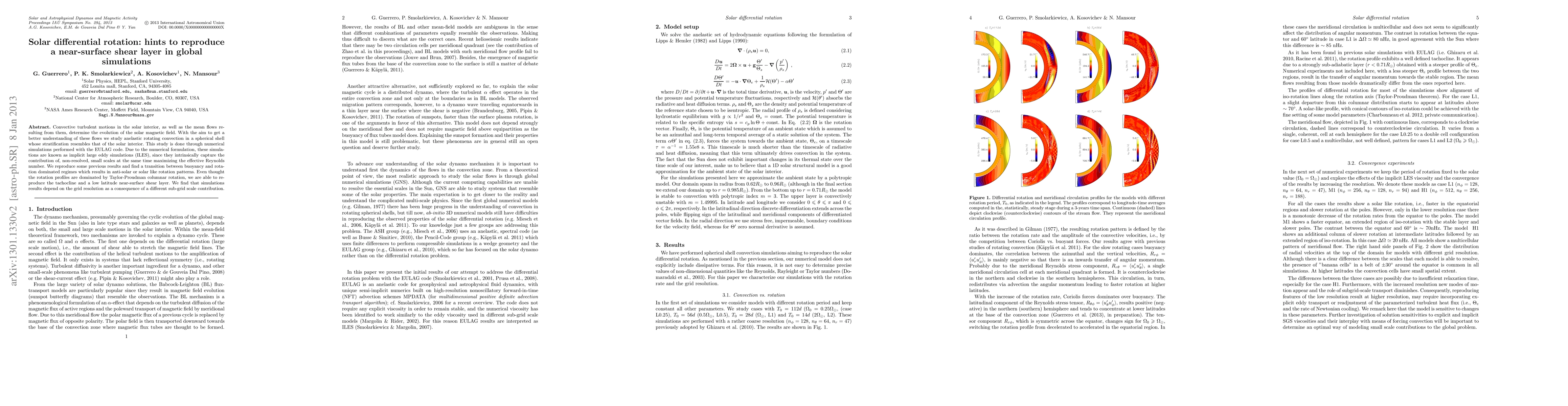 This paper investigates anelastic rotating convection in a spherical shell to understand solar interior flows and magnetic field evolution, using implicit large eddy simulations. The study successfully reproduces a near-surface shear layer, tachocline, and rotation patterns, highlighting the dependence on grid resolution due to varying sub-grid scale contributions.