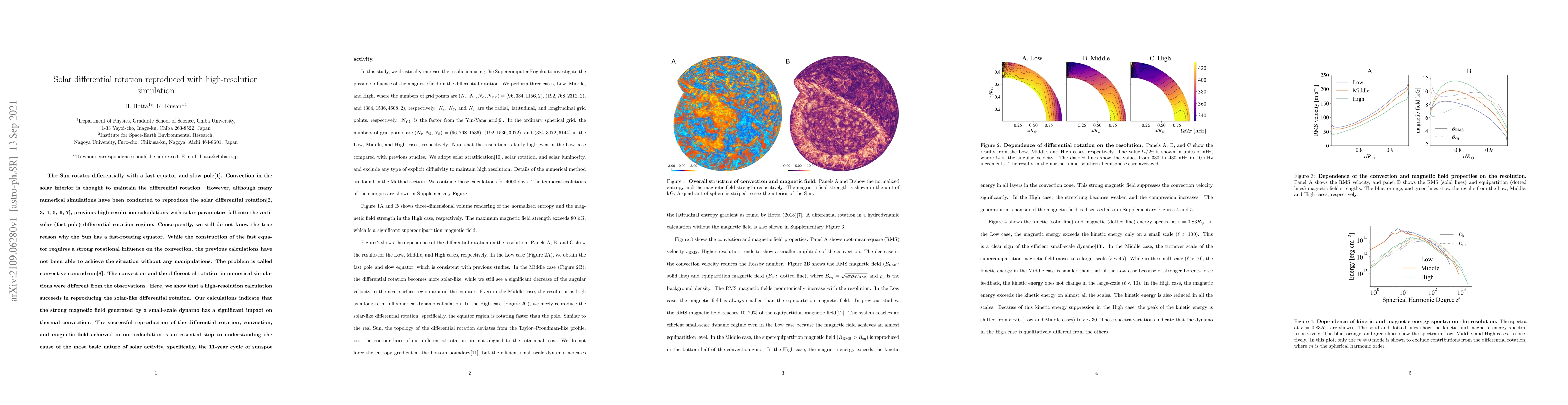 This paper reports a high-resolution simulation successfully reproducing the Sun's differential rotation with a fast equator and slow poles, resolving the "convective conundrum." The study attributes the success to the influence of a strong magnetic field generated by a small-scale dynamo on thermal convection.