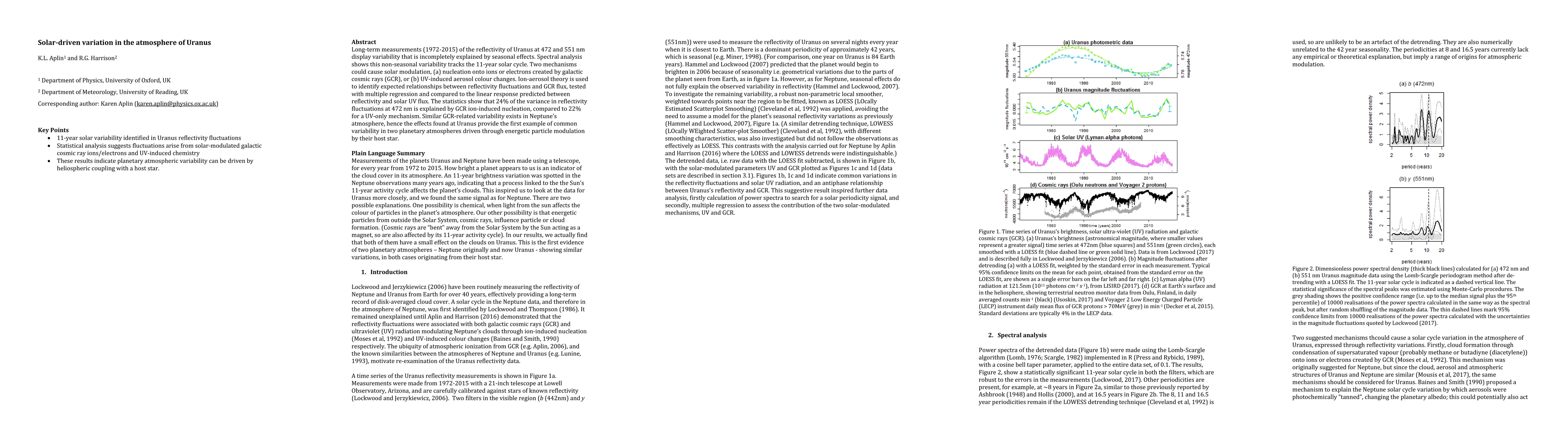 Long-term measurements (1972-2015) of the reflectivity of Uranus at 472 and 551 nm display variability that is incompletely explained by seasonal effects. Spectral analysis shows this non-seasonal variability tracks the 11-year solar cycle. Two mechanisms could cause solar modulation, (a) nucleation onto ions or electrons created by galactic cosmic rays (GCR), or (b) UV-induced aerosol colour changes. Ion-aerosol theory is used to identify expected relationships between reflectivity fluctuations and GCR flux, tested with multiple regression and compared to the linear response predicted between reflectivity and solar UV flux. The statistics show that 24%of the variance in reflectivity fluctuations at 472 nm is explained by GCR ion-induced nucleation, compared to 22% for a UV-only mechanism. Similar GCR-related variability exists in Neptune's atmosphere, hence the effects found at Uranus provide the first example of common variability in two planetary atmospheres driven through energetic particle modulation by their host star.