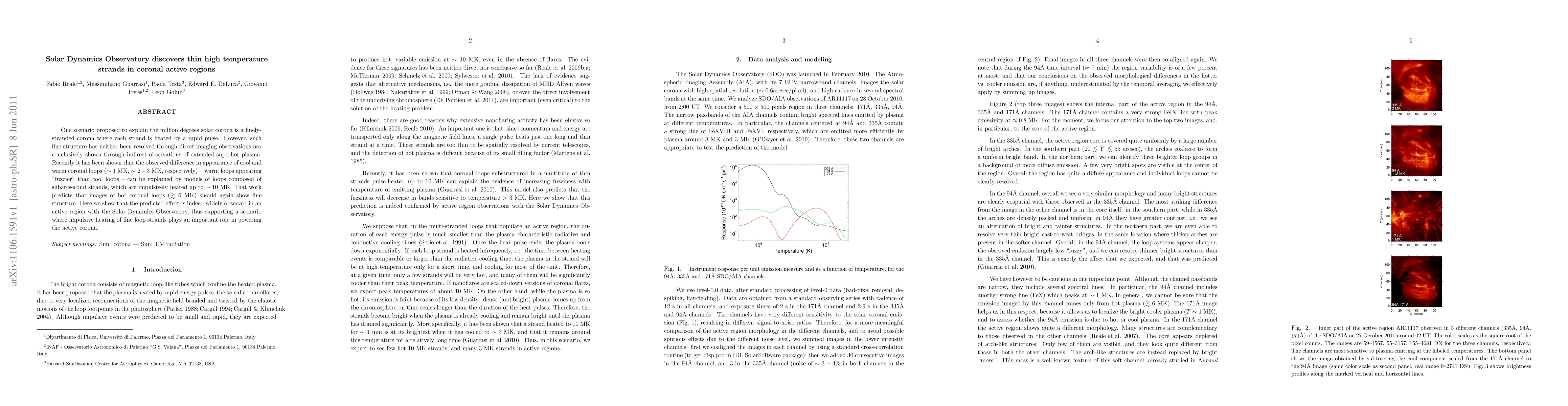 The Solar Dynamics Observatory has discovered thin, high-temperature strands in coronal active regions, supporting the theory of impulsively heated fine loop strands in the solar corona. These strands, which are subarcsecond in size, provide evidence for the finely-stranded corona model that explains the million-degree temperature of the solar corona.