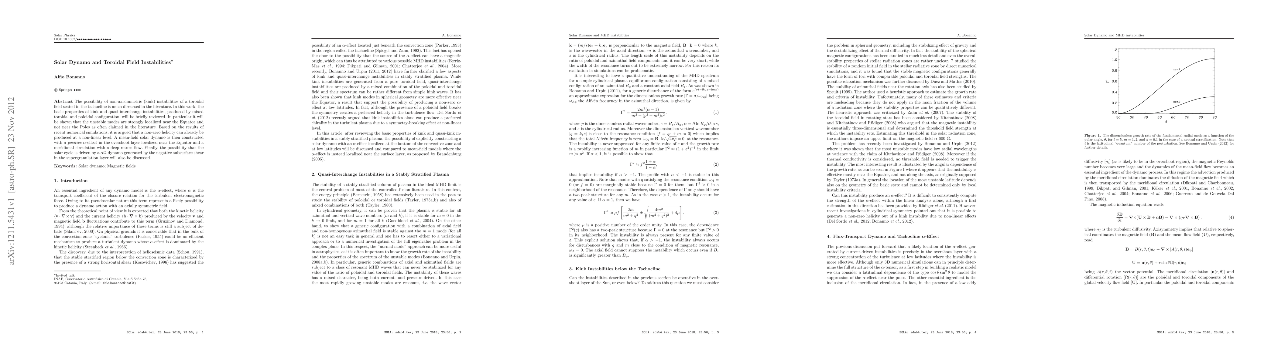 This paper reviews instabilities in the solar dynamo, particularly kink and quasi-interchange instabilities in the tachocline, showing they are localized near the Equator rather than the Poles. It also discusses the production of non-zero helicity and proposes a mean-field solar dynamo model driven by the $\alpha\Omega$ effect in the supergranulation layer.
