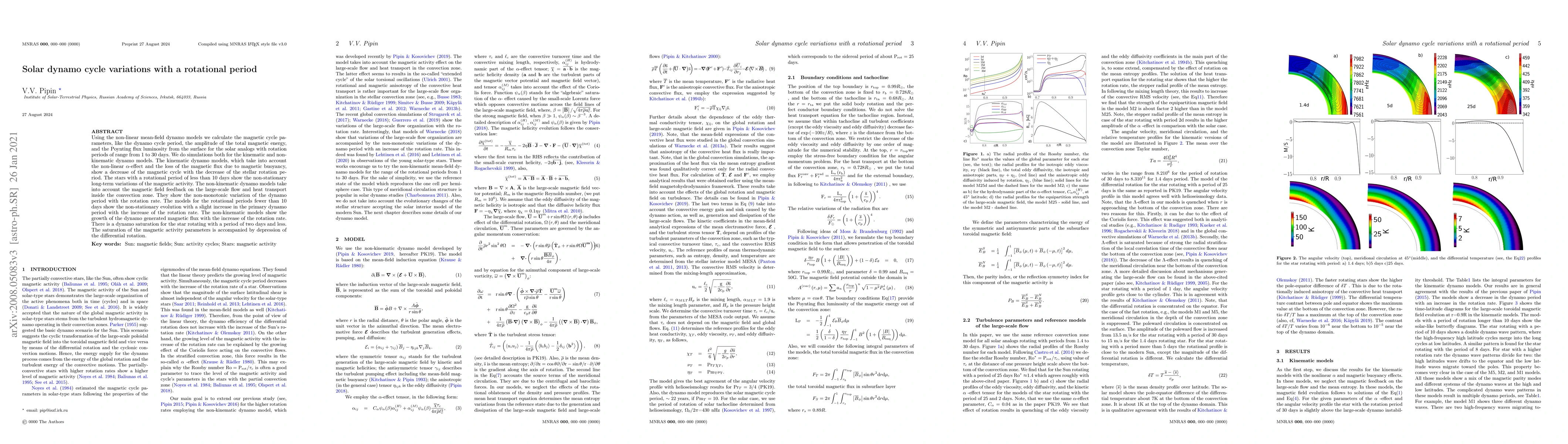 Using the non-linear mean-field dynamo models we calculate the magnetic cycle parameters, like the dynamo cycle period, the amplitude of the total magnetic energy, and the Poynting flux luminosity from the surface for the solar analogs with rotation periods of range from 1 to 30 days. We do simulations both for the kinematic and non-kinematic dynamo models. The kinematic dynamo models, which take into account the non-linear $\alpha$-effect and the loss of the magnetic flux due to magnetic buoyancy, show a decrease of the magnetic cycle with the decrease of the stellar rotation period. The stars with a rotational period of less than 10 days show the non-stationary long-term variations of the magnetic activity. The non-kinematic dynamo models take into account the magnetic field feedback on the large-scale flow and heat transport inside the convection zone. They show the non-monotonic variation of the dynamo period with the rotation rate. The models for the rotational periods fewer than 10 days show the non-stationary evolution with a slight increase in the primary dynamo period with the increase of the rotation rate. The non-kinematic models show the growth of the dynamo generated magnetic flux with the increase of the rotation rate. There is a dynamo saturation for the star rotating with a period of two days and less. The saturation of the magnetic activity parameters is accompanied by depression of the differential rotation.