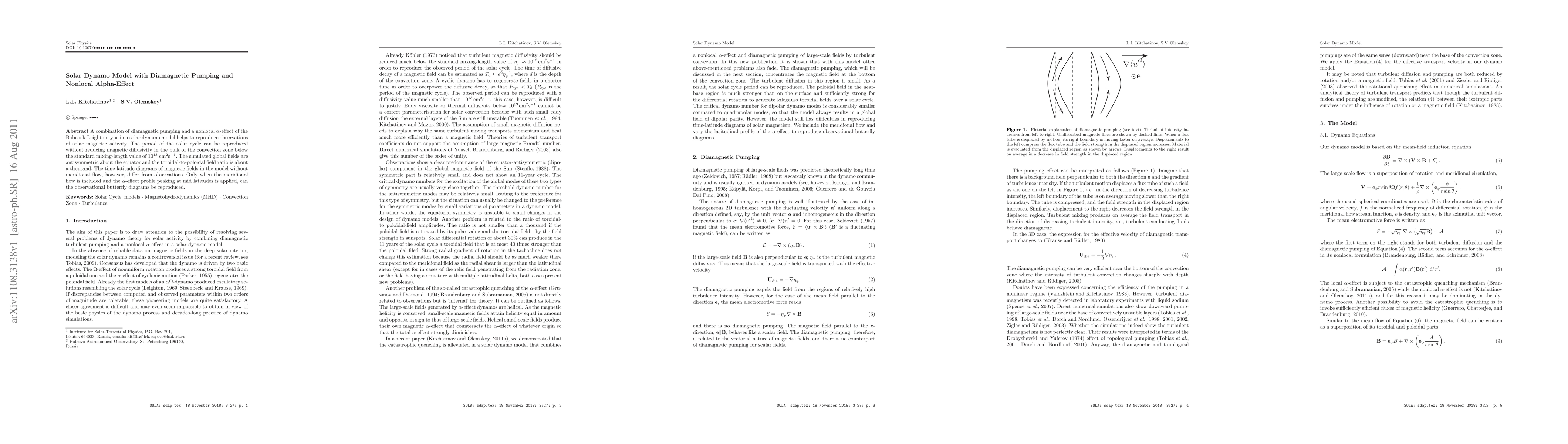 This paper presents a solar dynamo model incorporating diamagnetic pumping and a nonlocal alpha-effect, successfully reproducing solar magnetic activity cycles without lowering magnetic diffusivity. The inclusion of meridional flow and an alpha-effect profile peaking at mid-latitudes is crucial for matching observed butterfly diagrams.