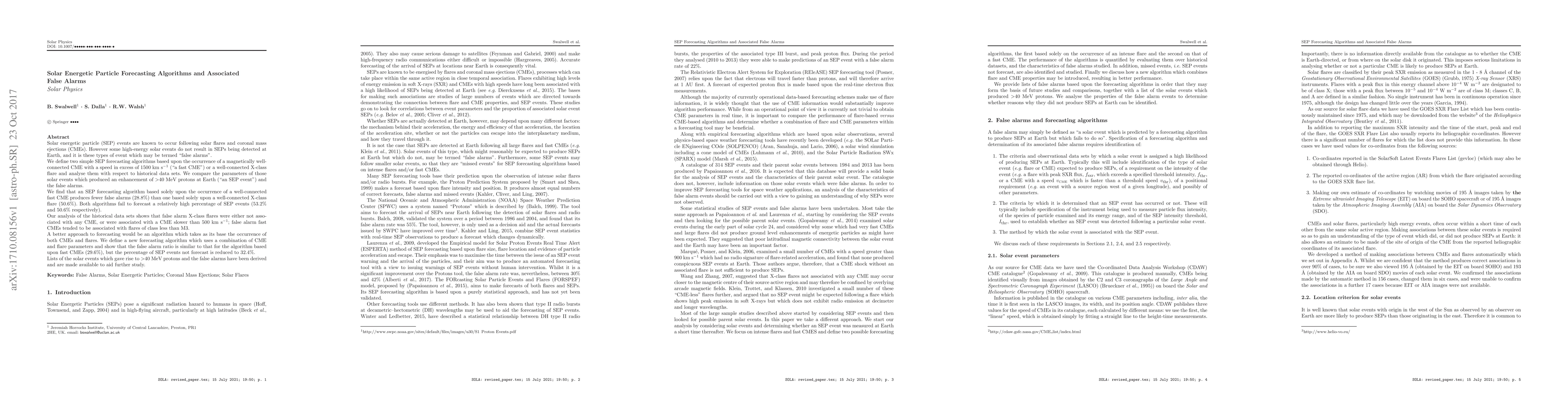 The research analyzes two simple Solar Energetic Particle (SEP) forecasting algorithms based on magnetically well-connected solar events (fast CMEs and X-class flares) using historical datasets. It evaluates their false alarm rates and the percentage of actual SEP events missed.