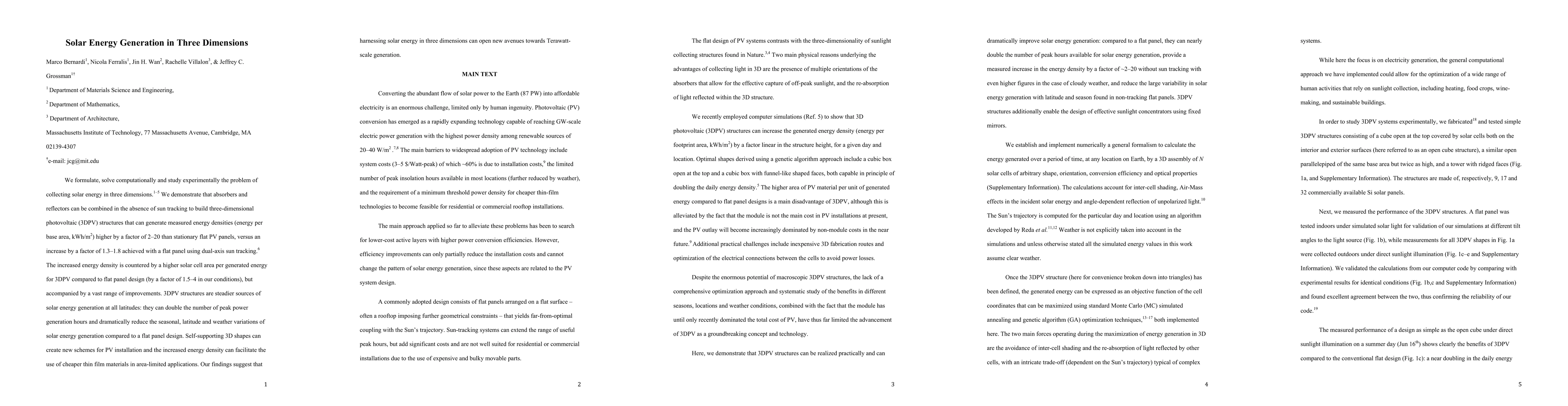 We formulate, solve computationally and study experimentally the problem of collecting solar energy in three dimensions(1-5). We demonstrate that absorbers and reflectors can be combined in the absence of sun tracking to build three-dimensional photovoltaic (3DPV) structures that can generate measured energy densities (energy per base area, kWh/m2) higher by a factor of 2-20 than stationary flat PV panels, versus an increase by a factor of 1.3-1.8 achieved with a flat panel using dual-axis sun tracking(6). The increased energy density is countered by a higher solar cell area per generated energy for 3DPV compared to flat panel design (by a factor of 1.5-4 in our conditions), but accompanied by a vast range of improvements. 3DPV structures are steadier sources of solar energy generation at all latitudes: they can double the number of peak power generation hours and dramatically reduce the seasonal, latitude and weather variations of solar energy generation compared to a flat panel design. Self-supporting 3D shapes can create new schemes for PV installation and the increased energy density can facilitate the use of cheaper thin film materials in area-limited applications. Our findings suggest that harnessing solar energy in three dimensions can open new avenues towards Terawatt-scale generation.