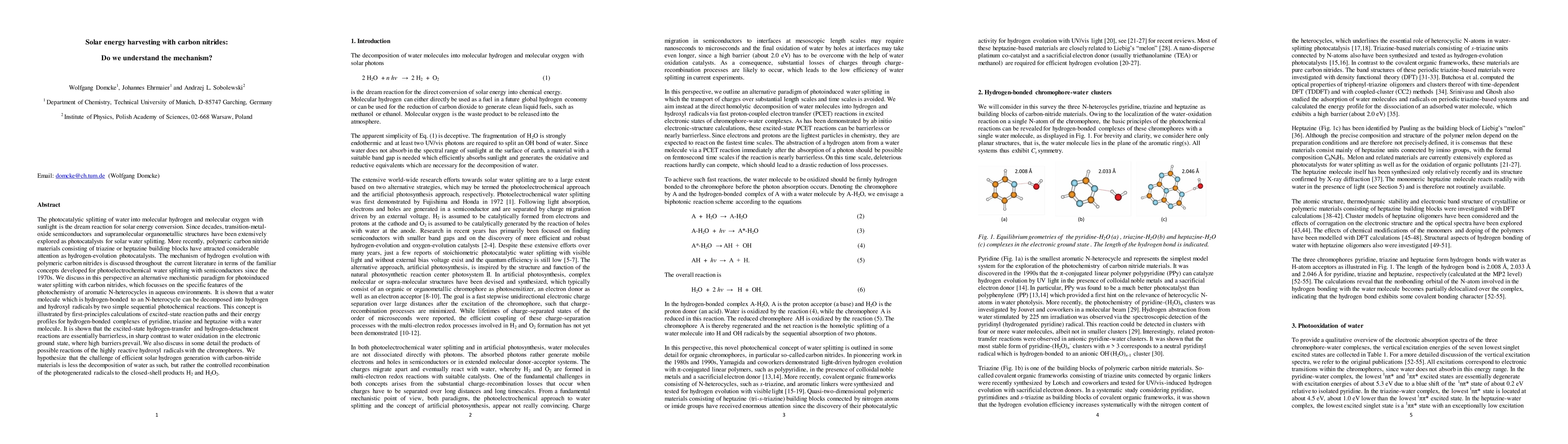 The photocatalytic splitting of water into molecular hydrogen and molecular oxygen with sunlight is the dream reaction for solar energy conversion. Since decades, transition-metal-oxide semiconductors and supramolecular organometallic structures have been extensively explored as photocatalysts for solar water splitting. More recently, polymeric carbon nitride materials consisting of triazine or heptazine building blocks have attracted considerable attention as hydrogen-evolution photocatalysts. The mechanism of hydrogen evolution with polymeric carbon nitrides is discussed throughout the current literature in terms of the familiar concepts developed for photoelectrochemical water splitting with semiconductors since the 1970s. We discuss in this perspective an alternative mechanistic paradigm for photoinduced water splitting with carbon nitrides, which focusses on the specific features of the photochemistry of aromatic N-heterocycles in aqueous environments. It is shown that a water molecule which is hydrogen-bonded to an N-heterocycle can be decomposed into hydrogen and hydroxyl radicals by two simple sequential photochemical reactions. This concept is illustrated by first-principles calculations of excited-state reaction paths and their energy profiles for hydrogen-bonded complexes of pyridine, triazine and heptazine with a water molecule.