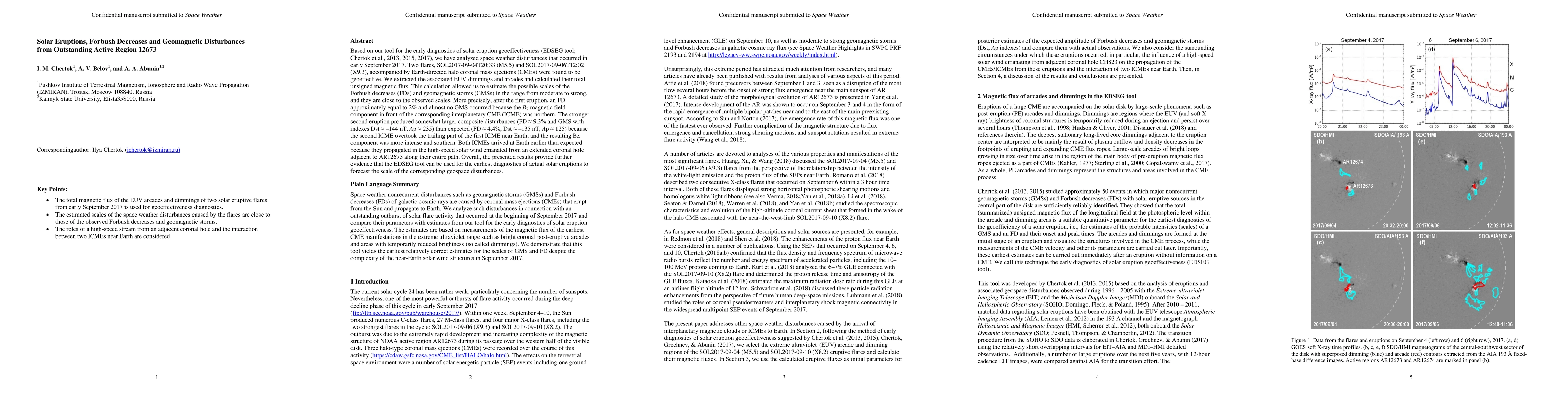 Based on our tool for the early diagnostics of solar eruption geoeffectiveness (EDSEG tool; Chertok et al., 2013, 2015, 2017), we have analyzed space weather disturbances that occurred in early September 2017. Two flares, SOL2017-09-04T20:33 (M5.5) and SOL2017-09-06T12:02 (X9.3), accompanied by Earth-directed halo coronal mass ejections (CMEs) were found to be geoeffective. We extracted the associated EUV dimmings and arcades and calculated their total unsigned magnetic flux. This calculation allowed us to estimate the possible scales of the Forbush decreases (FDs) and geomagnetic storms (GMSs) in the range from moderate to strong, and they are close to the observed scales. More precisely, after the first eruption, an FD approximately equal to 2% and almost no GMS occurred because the Bz magnetic field component in front of the corresponding interplanetary CME (ICME) was northern. The stronger second eruption produced somewhat larger composite disturbances (FD ~ 9.3% and GMS with indexes Dst ~ -144 nT, Ap ~ 235) than expected (FD ~ 4.4%, Dst ~ -135 nT, Ap ~ 125) because the second ICME overtook the trailing part of the first ICME near Earth, and the resulting Bz component was more intense and southern. Both ICMEs arrived at Earth earlier than expected because they propagated in the high-speed solar wind emanated from an extended coronal hole adjacent to AR12673 along their entire path. Overall, the presented results provide further evidence that the EDSEG tool can be used for the earliest diagnostics of actual solar eruptions to forecast the scale of the corresponding geospace disturbances.
