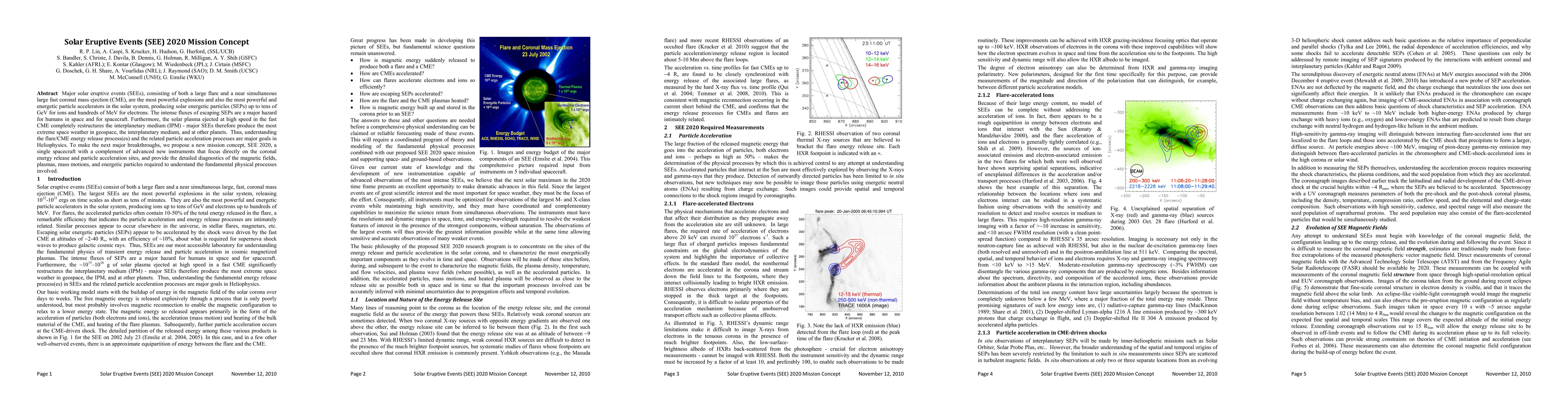 The research proposes a new mission, SEE 2020, to study solar eruptive events (SEEs), which are intense solar explosions causing powerful particle emissions harmful to astronauts and spacecraft. The mission aims to understand the energy release and particle acceleration processes involved in SEEs through advanced instrumentation focused on coronal energy release sites and providing detailed diagnostics of magnetic fields, plasmas, mass motions, and energetic particles.