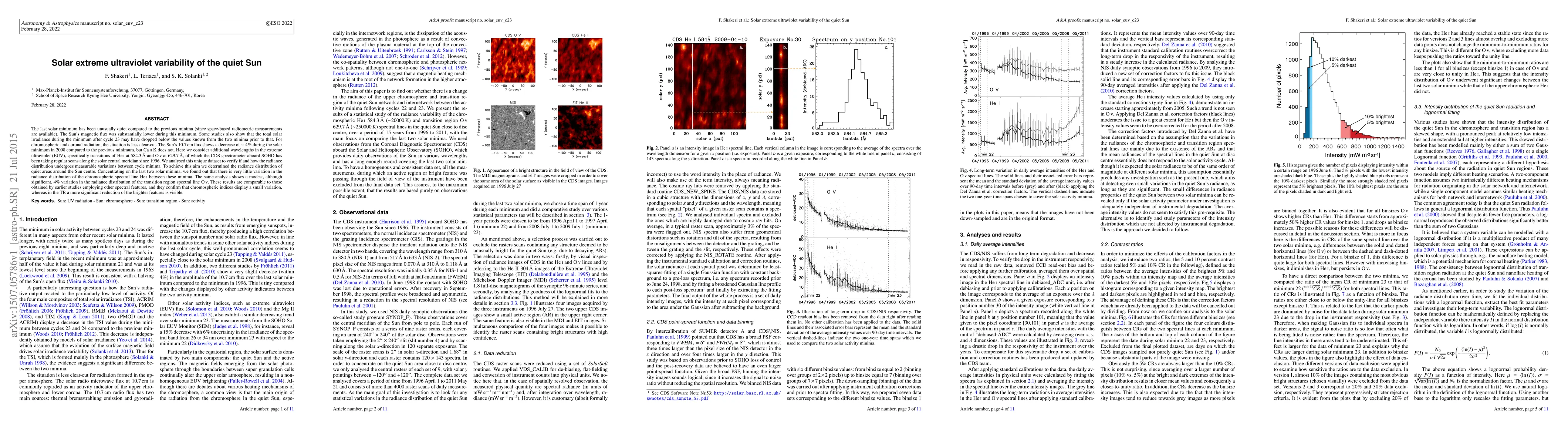 The study investigates solar extreme ultraviolet variability during the last quiet Sun minimum, finding a small variation in chromospheric spectral lines but a more significant reduction in transition region spectral lines compared to previous minima.