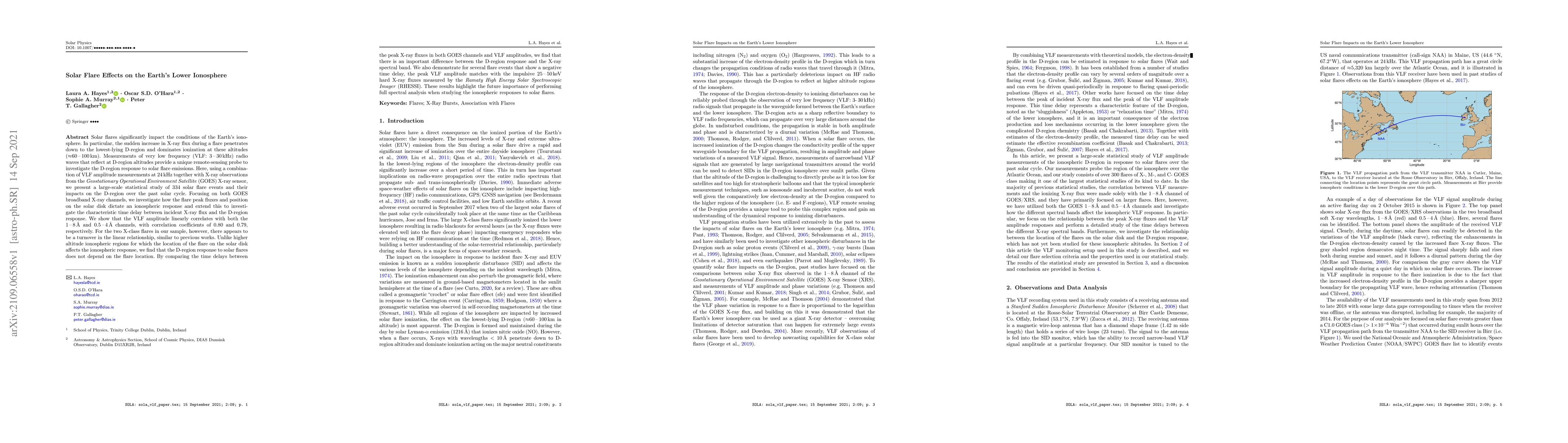 This study investigates the impact of solar flares on the Earth's D-region ionosphere using VLF radio wave measurements and X-ray observations. The research finds a strong linear correlation between VLF amplitude and X-ray flux, showing that the D-region's response is independent of the flare's position on the solar disk, unlike higher altitude regions.