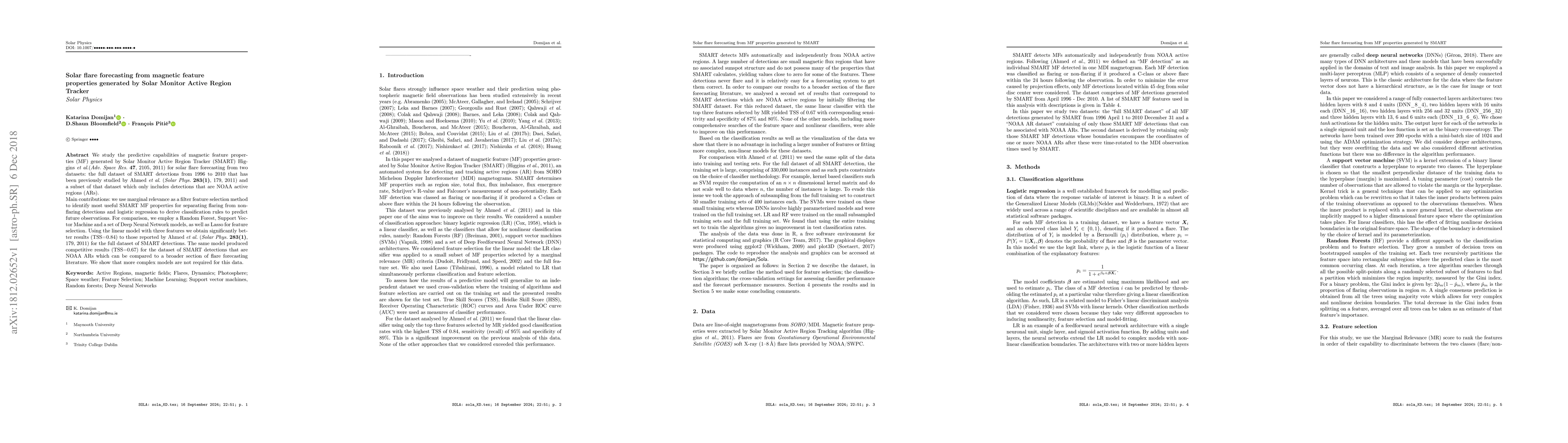 We study the predictive capabilities of magnetic feature properties (MF) generated by Solar Monitor Active Region Tracker (SMART) for solar flare forecasting from two datasets: the full dataset of SMART detections from 1996 to 2010 that has been previously studied by Ahmed et al. (2011) and a subset of that dataset which only includes detections that are NOAA active regions (ARs). Main contributions: we use marginal relevance as a filter feature selection method to identify most useful SMART MF properties for separating flaring from non-flaring detections and logistic regression to derive classification rules to predict future observations. For comparison, we employ a Random Forest, Support Vector Machine and a set of Deep Neural Network models, as well as Lasso for feature selection. Using the linear model with three features we obtain significantly better results (TSS=0.84) to those reported by Ahmed et al.(2011) for the full dataset of SMART detections. The same model produced competitive results (TSS=0.67) for the dataset of SMART detections that are NOAA ARs which can be compared to a broader section of flare forecasting literature. We show that more complex models are not required for this data.
