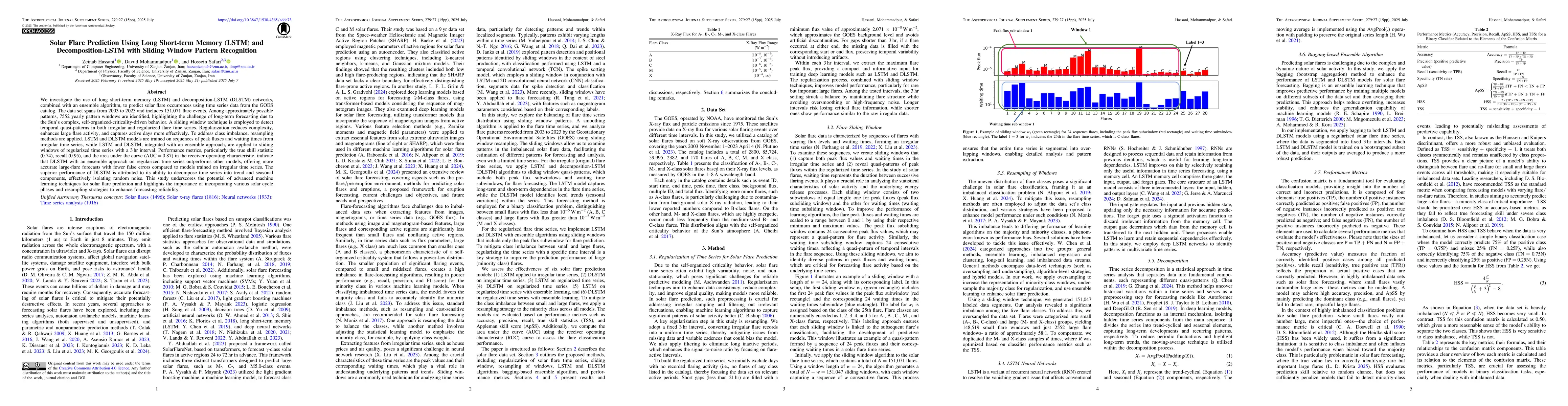 We investigate the use of Long Short-Term Memory (LSTM) and Decomposition-LSTM (DLSTM) networks, combined with an ensemble algorithm, to predict solar flare occurrences using time-series data from the GOES catalog. The dataset spans from 2003 to 2023 and includes 151,071 flare events. Among approximately possible patterns, 7,552 yearly pattern windows are identified, highlighting the challenge of long-term forecasting due to the Sun's complex, self-organized criticality-driven behavior. A sliding window technique is employed to detect temporal quasi-patterns in both irregular and regularized flare time series. Regularization reduces complexity, enhances large flare activity, and captures active days more effectively. To address class imbalance, resampling methods are applied. LSTM and DLSTM models are trained on sequences of peak fluxes and waiting times from irregular time series, while LSTM and DLSTM, integrated with an ensemble approach, are applied to sliding windows of regularized time series with a 3-hour interval. Performance metrics, particularly TSS (0.74), recall (0.95) and the area under the curve (AUC=0.87) in the receiver operating characteristic (ROC), indicate that DLSTM with an ensemble approach on regularized time series outperforms other models, offering more accurate large-flare forecasts with fewer false errors compared to models trained on irregular time series. The superior performance of DLSTM is attributed to its ability to decompose time series into trend and seasonal components, effectively isolating random noise. This study underscores the potential of advanced machine learning techniques for solar flare prediction and highlights the importance of incorporating various solar cycle phases and resampling strategies to enhance forecasting reliability.