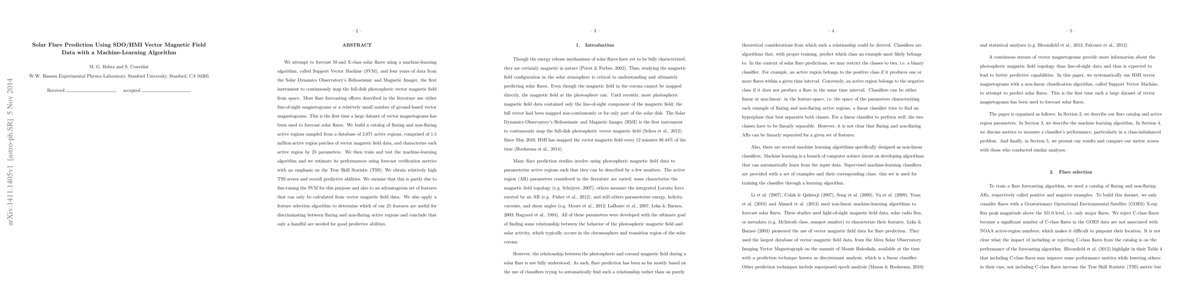 This paper forecasts M- and X-class solar flares using a Support Vector Machine (SVM) algorithm trained on four years of vector magnetic field data from the SDO/HMI. The study finds high predictive capabilities, attributing success to the extensive dataset and fine-tuned SVM, and identifies a subset of key features for effective flare prediction.