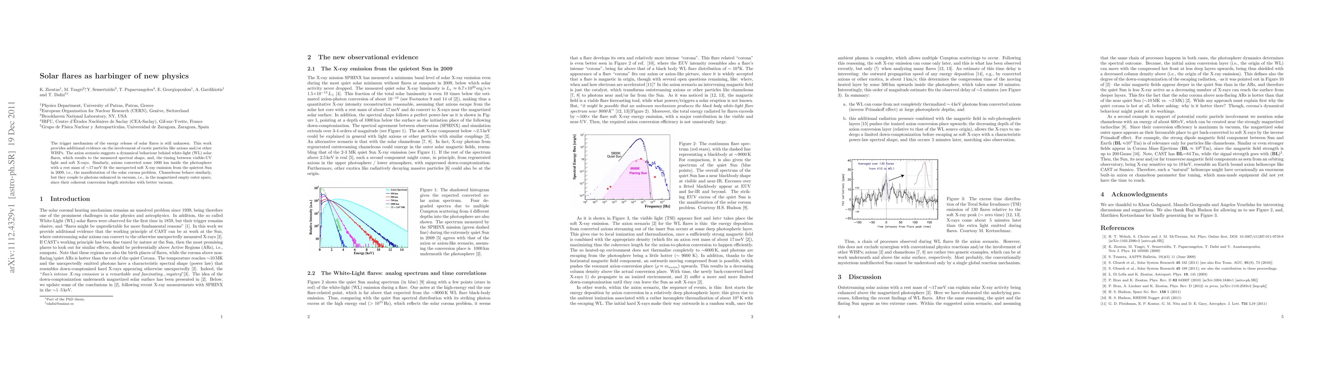 This work provides additional evidence on the involvement of exotic particles like axions and/or other WISPs, following recent measurements during the quietest Sun and flaring Sun. Thus, SPHINX mission observed a minimum basal soft X-rays emission in the extreme solar minimum in 2009. The same scenario (with ~17 meV axions) fits also the dynamical behaviour of white-light solar flares, like the measured spectral components in the visible and in soft X-rays, and, the timing between them. Solar chameleons remain a viable candidate, since they may preferentially convert to photons in outer space.