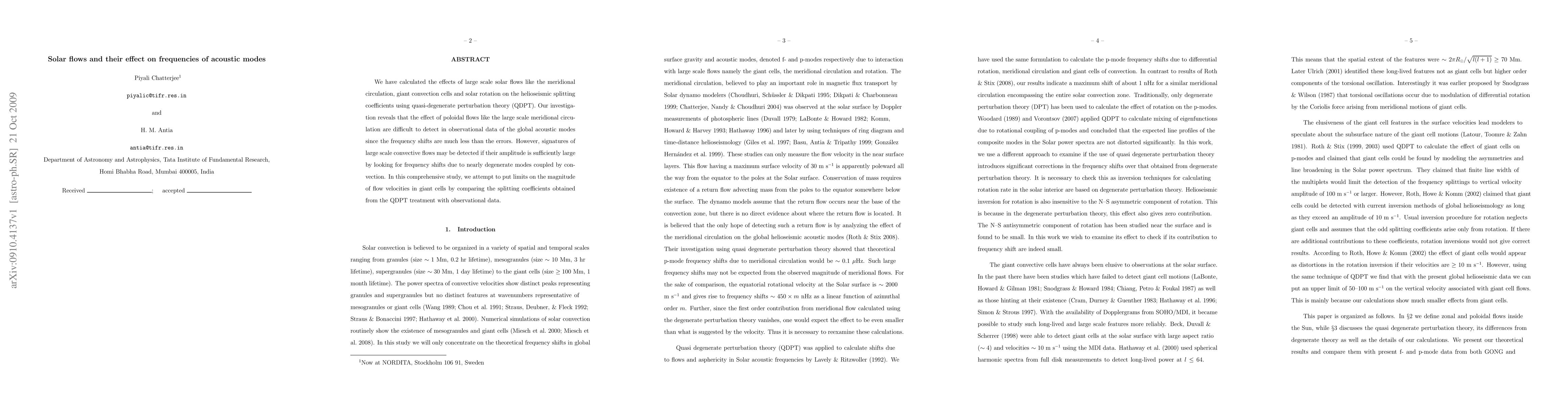 We have calculated the effects of large scale solar flows like the meridional circulation, giant convection cells and solar rotation on the helioseismic splitting coefficients using quasi-degenerate perturbation theory (QDPT). Our investigation reveals that the effect of poloidal flows like the large scale meridional circulation are difficult to detect in observational data of the global acoustic modes since the frequency shifts are much less than the errors. However, signatures of large scale convective flows may be detected if their amplitude is sufficiently large by looking for frequency shifts due to nearly degenerate modes coupled by convection. In this comprehensive study, we attempt to put limits on the magnitude of flow velocities in giant cells by comparing the splitting coefficients obtained from the QDPT treatment with observational data.