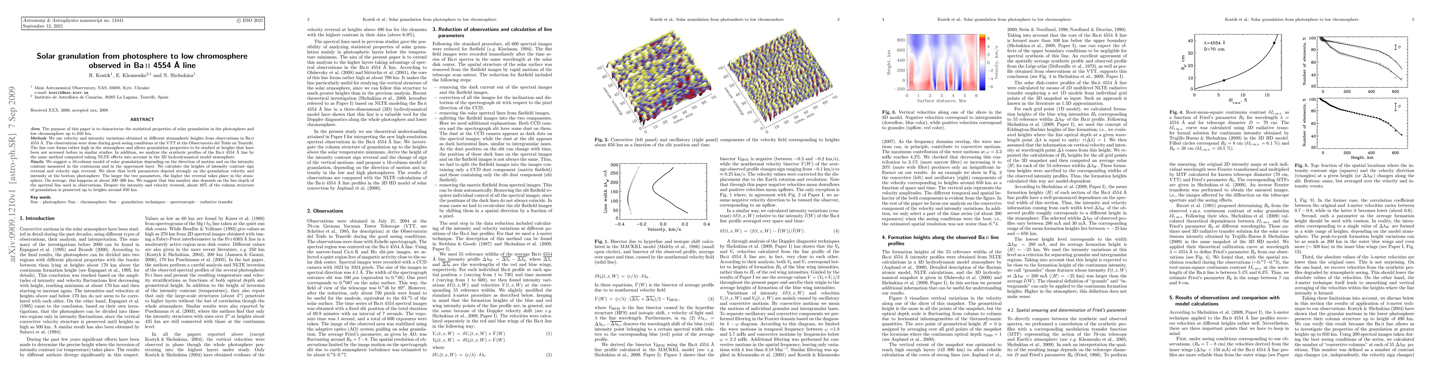 This paper characterizes solar granulation from the photosphere to the low chromosphere using observations of BaII 4554 Å line, revealing that intensity and velocity reversals occur at around 200-300 km, with about 40% of granulation structure preserved up to 650 km.