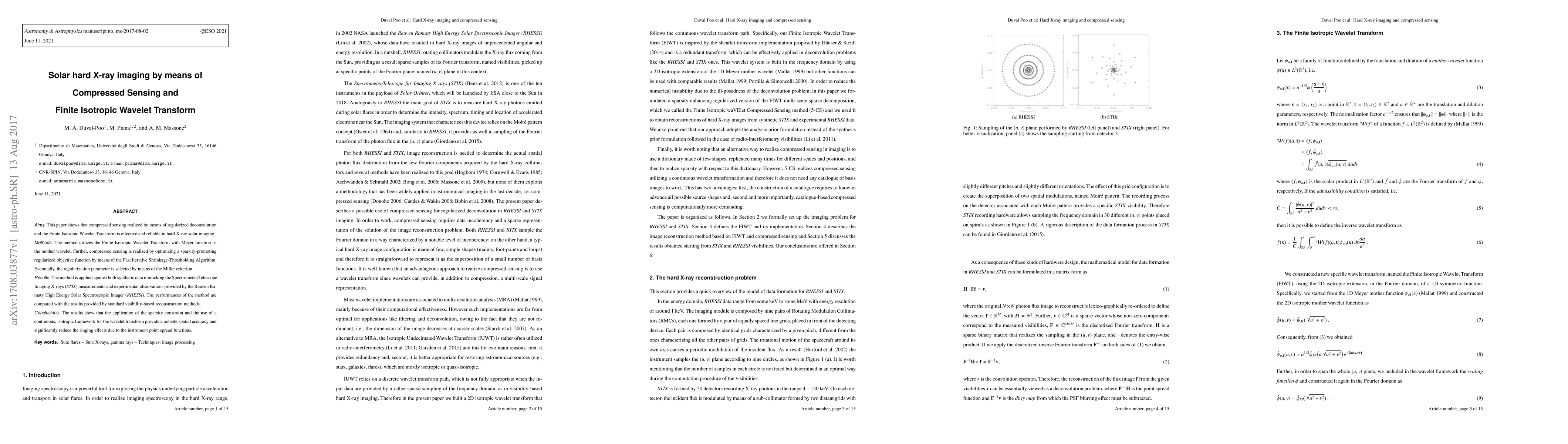 This paper demonstrates that compressed sensing combined with the Finite Isotropic Wavelet Transform and regularized deconvolution is effective for solar hard X-ray imaging, outperforming standard reconstruction methods by reducing ringing effects and improving spatial accuracy. The method is validated using both synthetic and real observational data from STIX and RHESSI.