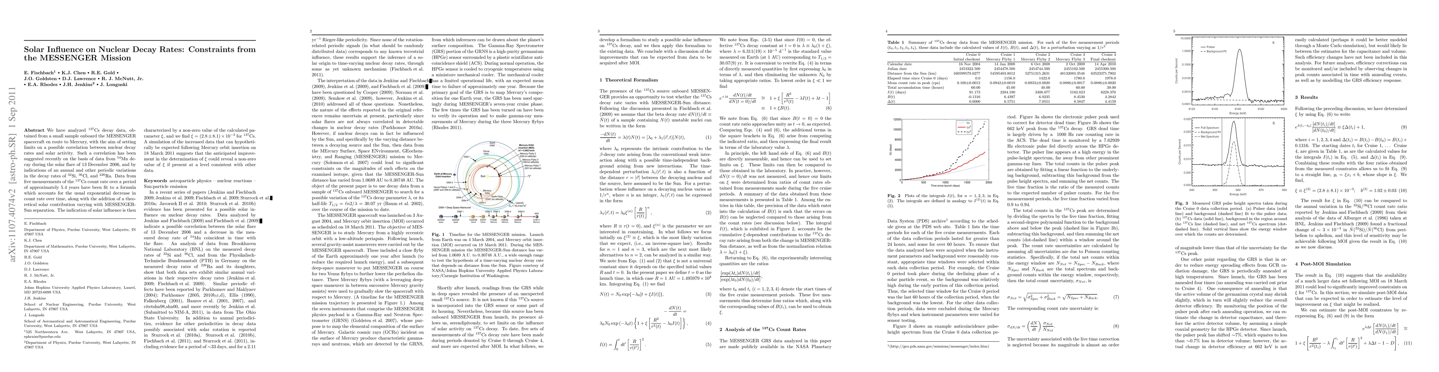 This research analyzes Cs-137 decay data from the MESSENGER spacecraft to investigate a potential correlation between nuclear decay rates and solar activity. The study finds a calculated parameter \xi of (2.8±8.1)x10^{-3}, indicating no significant solar influence on Cs-137 decay, but suggests that future data from Mercury orbit could reveal a non-zero \xi if such an effect exists.