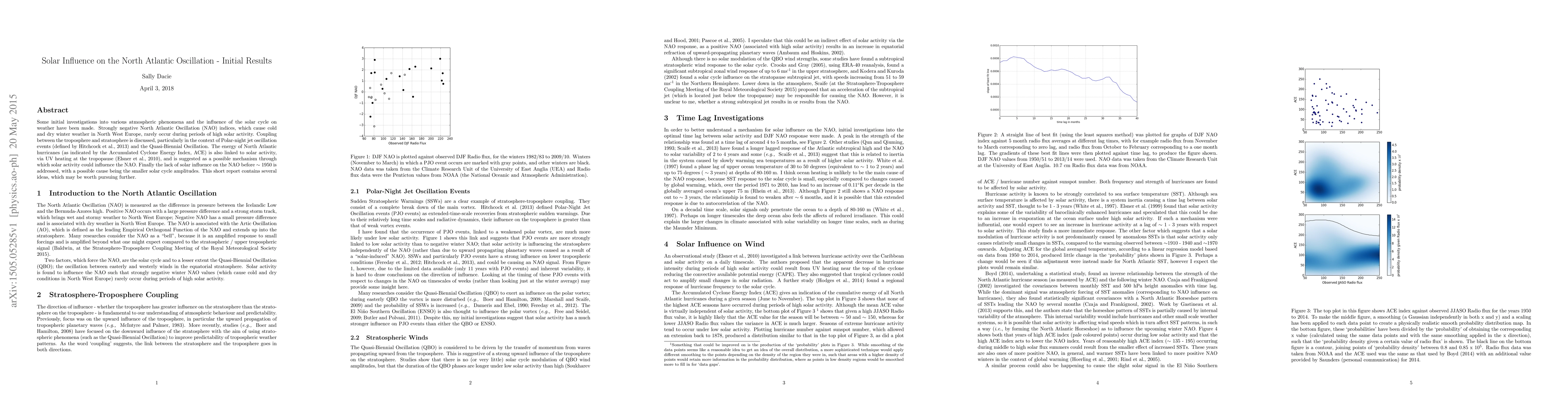 This paper explores the potential influence of solar activity on the North Atlantic Oscillation (NAO), suggesting that high solar activity correlates with rare occurrences of strongly negative NAO indices, which lead to colder winters in North West Europe. It also discusses the coupling between the troposphere and stratosphere, linking solar activity to the energy of North Atlantic hurricanes.