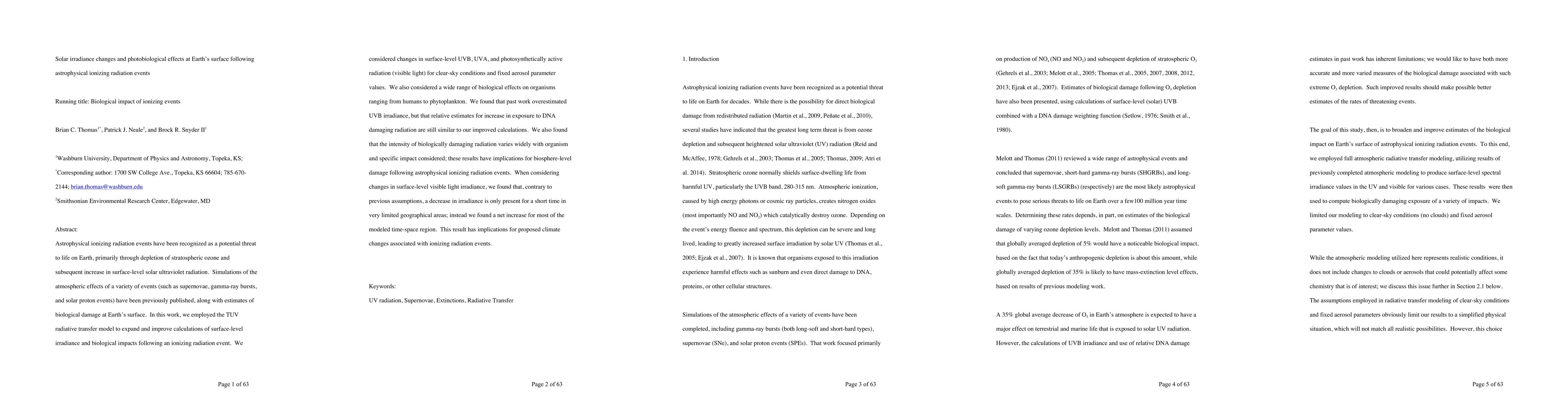 Astrophysical ionizing radiation events have been recognized as a potential threat to life on Earth, primarily through depletion of stratospheric ozone and subsequent increase in surface-level solar ultraviolet radiation. Simulations of the atmospheric effects of a variety of events (such as supernovae, gamma-ray bursts, and solar proton events) have been previously published, along with estimates of biological damage at Earth's surface. In this work, we employed the TUV radiative transfer model to expand and improve calculations of surface-level irradiance and biological impacts following an ionizing radiation event. We considered changes in surface-level UVB, UVA, and photosynthetically active radiation (visible light) for clear-sky conditions and fixed aerosol parameter values. We also considered a wide range of biological effects on organisms ranging from humans to phytoplankton. We found that past work overestimated UVB irradiance, but that relative estimates for increase in exposure to DNA damaging radiation are still similar to our improved calculations. We also found that the intensity of biologically damaging radiation varies widely with organism and specific impact considered; these results have implications for biosphere-level damage following astrophysical ionizing radiation events. When considering changes in surface-level visible light irradiance, we found that, contrary to previous assumptions, a decrease in irradiance is only present for a short time in very limited geographical areas; instead we found a net increase for most of the modeled time-space region. This result has implications for proposed climate changes associated with ionizing radiation events.