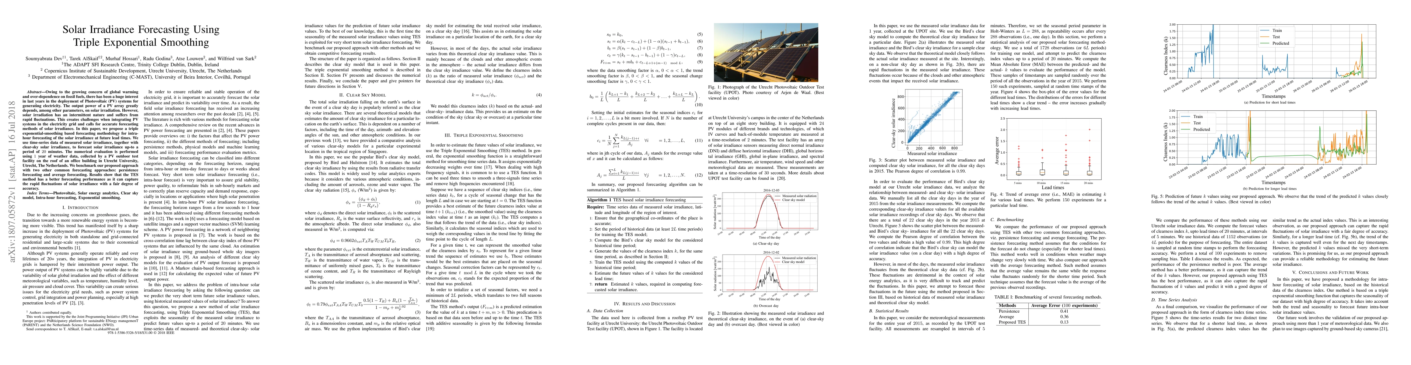 Owing to the growing concern of global warming and over-dependence on fossil fuels, there has been a huge interest in last years in the deployment of Photovoltaic (PV) systems for generating electricity. The output power of a PV array greatly depends, among other parameters, on solar irradiation. However, solar irradiation has an intermittent nature and suffers from rapid fluctuations. This creates challenges when integrating PV systems in the electricity grid and calls for accurate forecasting methods of solar irradiance. In this paper, we propose a triple exponential-smoothing based forecasting methodology for intra-hour forecasting of the solar irradiance at future lead times. We use time-series data of measured solar irradiance, together with clear-sky solar irradiance, to forecast solar irradiance up-to a period of 20 minutes. The numerical evaluation is performed using 1 year of weather data, collected by a PV outdoor test facility on the roof of an office building in Utrecht University, Utrecht, The Netherlands. We benchmark our proposed approach with two other common forecasting approaches: persistence forecasting and average forecasting. Results show that the TES method has a better forecasting performance as it can capture the rapid fluctuations of solar irradiance with a fair degree of accuracy.