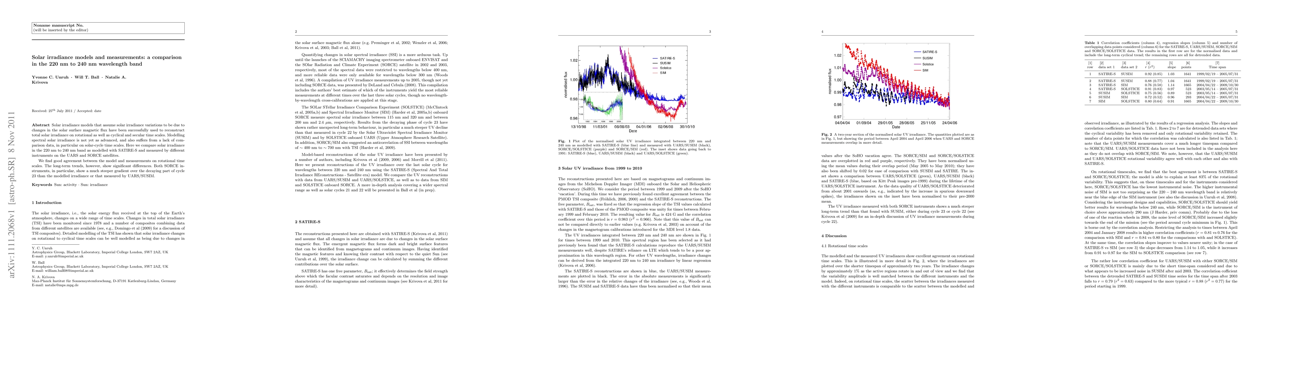 The research compares solar irradiance in the 220 nm to 240 nm band as modelled by SATIRE-S and measured by various instruments on UARS and SORCE satellites.