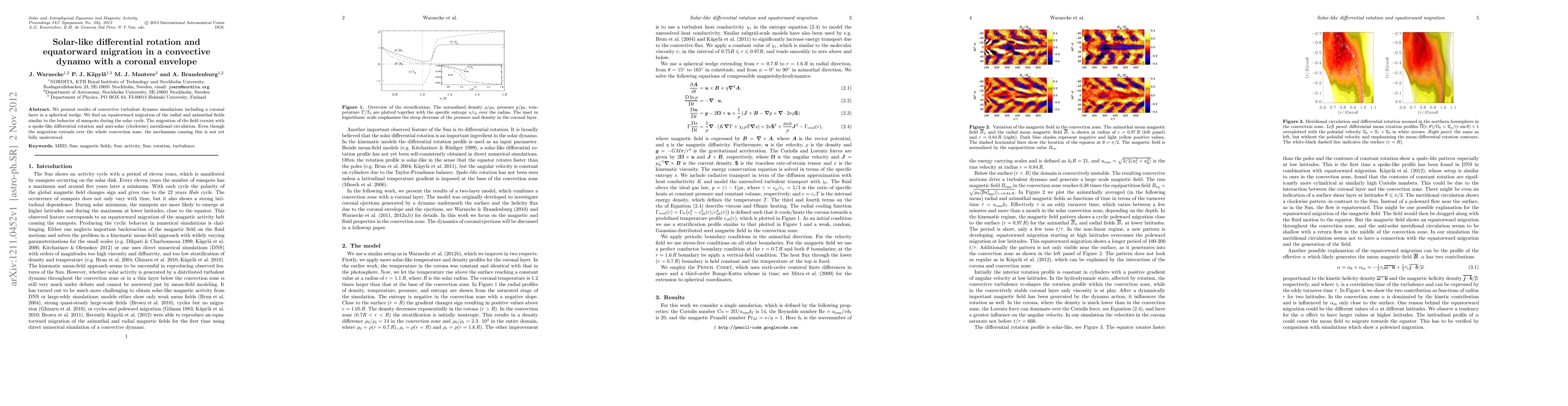 This paper reports on simulations of a convective dynamo with a coronal layer, revealing an equatorward migration of radial and azimuthal fields akin to sunspot behavior, alongside a spoke-like differential rotation and anti-solar meridional circulation, though the underlying mechanism for the migration remains unclear.