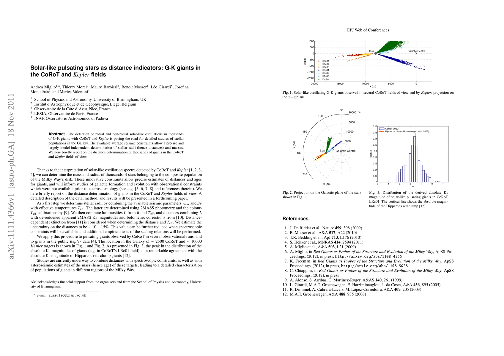 This paper reports on the use of solar-like oscillations in G-K giants observed by CoRoT and Kepler to determine precise stellar radii and masses, providing a model-independent method for measuring distances to these stars. Thousands of giants in the CoRoT and Kepler fields have been analyzed to yield accurate distance indicators.