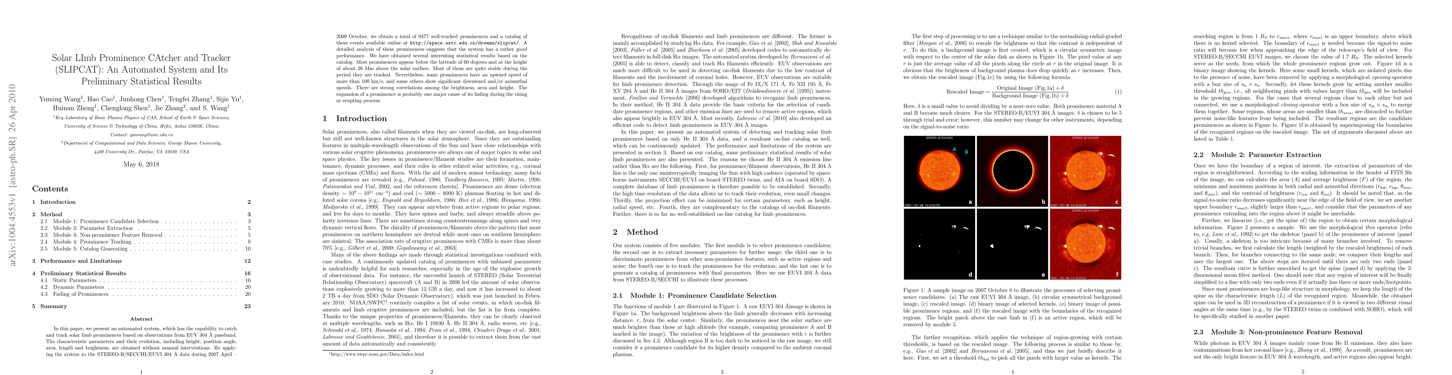 The SLIPCAT system automates the tracking and analysis of solar limb prominences from EUV 304 observations, yielding 9477 tracked events. Statistical results indicate most prominences occur below 60 degrees latitude and 26 Mm height, with strong correlations among brightness, area, and height.