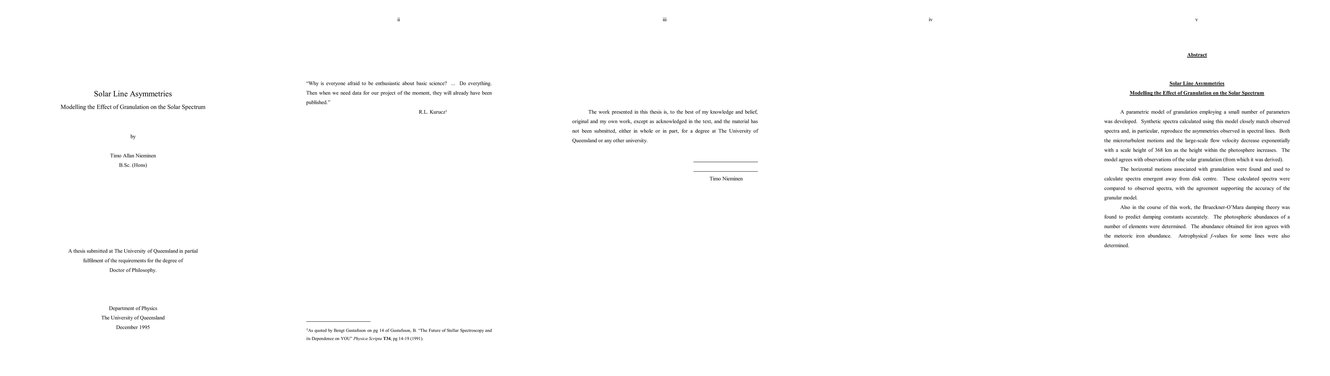 A parametric model of granulation employing a small number of parameters was developed. Synthetic spectra calculated using this model closely match observed spectra and, in particular, reproduce the asymmetries observed in spectral lines. Both the microturbulent motions and the large-scale flow velocity decrease exponentially with a scale height of 368 km as the height within the photosphere increases. The model agrees with observations of the solar granulation (from which it was derived). The horizontal motions associated with granulation were found and used to calculate spectra emergent away from disk centre. These calculated spectra were compared to observed spectra, with the agreement supporting the accuracy of the granular model. Also in the course of this work, the Brueckner-O'Mara damping theory was found to predict damping constants accurately. The photospheric abundances of a number of elements were determined. The abundance obtained for iron agrees with the meteoric iron abundance. Astrophysical f-values for some lines were also determined.