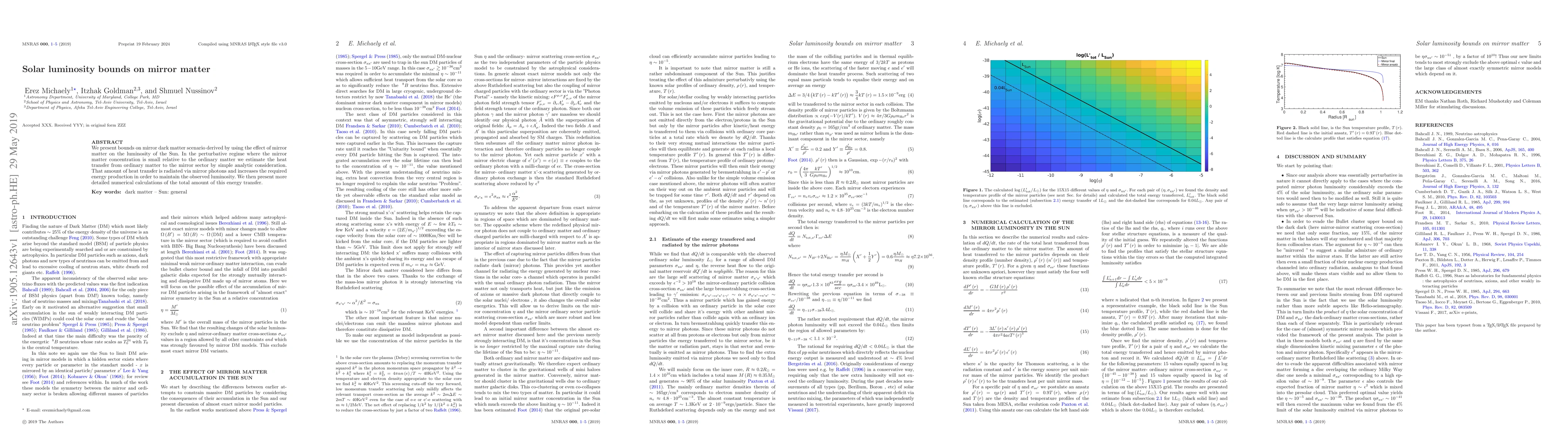 We present bounds on mirror dark matter scenario derived by using the effect of mirror matter on the luminosity of the Sun. In the perturbative regime where the mirror matter concentration is small relative to the ordinary matter we estimate the heat transfer from ordinary matter to the mirror sector by simple analytic consideration. That amount of heat transfer is radiated via mirror photons and increases the required energy production in order to maintain the observed luminosity. We then present more detailed numerical calculations of the total amount of this energy transfer.