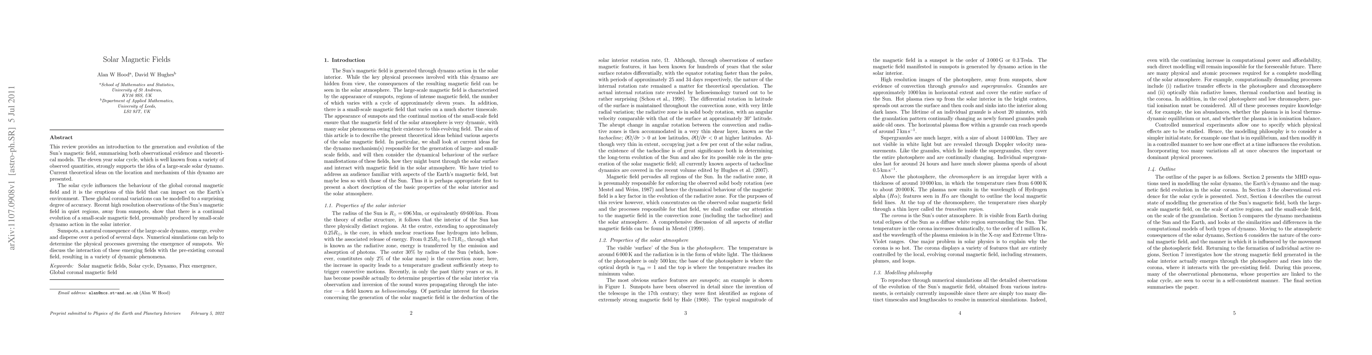 This review provides an introduction to the generation and evolution of the Sun's magnetic field, summarising both observational evidence and theoretical models. The eleven year solar cycle, which is well known from a variety of observed quantities, strongly supports the idea of a large-scale solar dynamo. Current theoretical ideas on the location and mechanism of this dynamo are presented. The solar cycle influences the behaviour of the global coronal magnetic field and it is the eruptions of this field that can impact on the Earth's environment. These global coronal variations can be modelled to a surprising degree of accuracy. Recent high resolution observations of the Sun's magnetic field in quiet regions, away from sunspots, show that there is a continual evolution of a small-scale magnetic field, presumably produced by small-scale dynamo action in the solar interior. Sunspots, a natural consequence of the large-scale dynamo, emerge, evolve and disperse over a period of several days. Numerical simulations can help to determine the physical processes governing the emergence of sunspots. We discuss the interaction of these emerging fields with the pre-existing coronal field, resulting in a variety of dynamic phenomena.