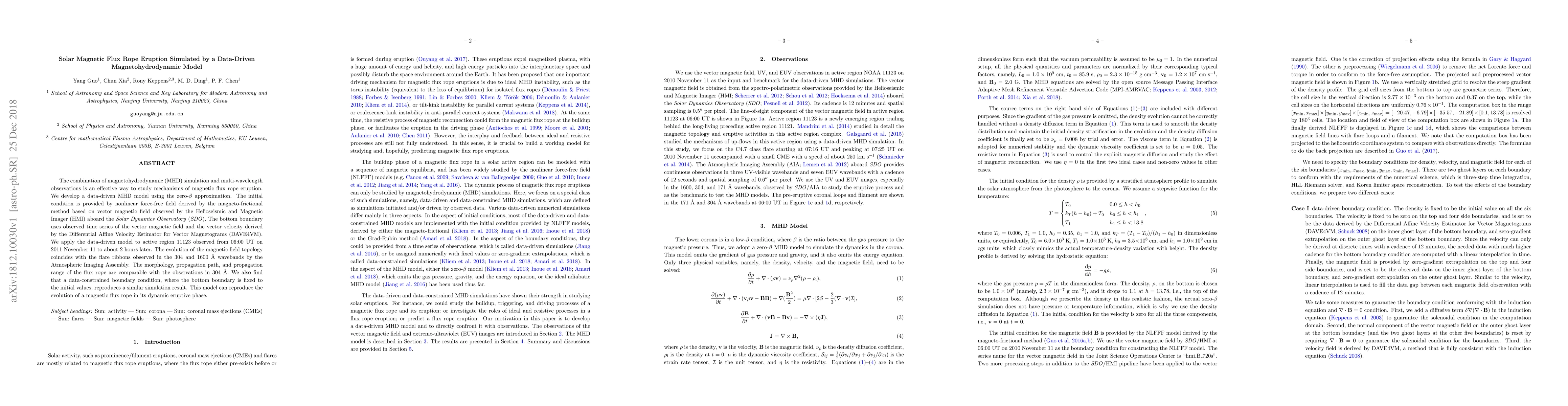 This study combines magnetohydrodynamic (MHD) simulations and multi-wavelength observations to investigate magnetic flux rope eruptions, developing a data-driven MHD model that accurately reproduces the observed evolution and morphology of an active region's magnetic flux rope eruption. The model's boundary conditions are constrained by observational data from the SDO/HMI and DAVE4VM, showing good agreement with flare observations.