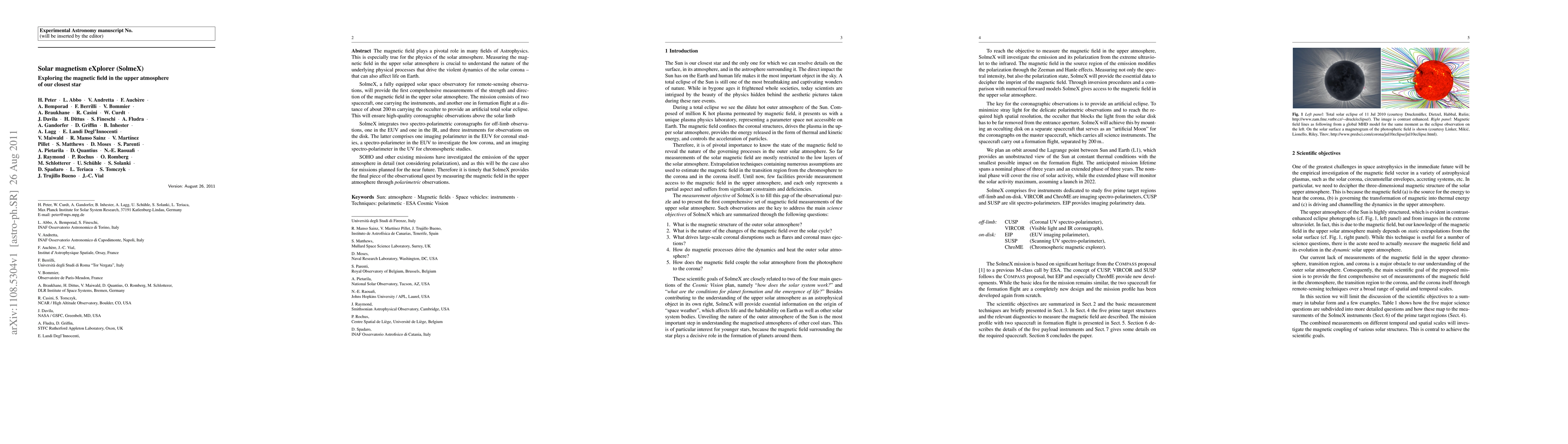 The magnetic field plays a pivotal role in many fields of Astrophysics. This is especially true for the physics of the solar atmosphere. Measuring the magnetic field in the upper solar atmosphere is crucial to understand the nature of the underlying physical processes that drive the violent dynamics of the solar corona -- that can also affect life on Earth. SolmeX, a fully equipped solar space observatory for remote-sensing observations, will provide the first comprehensive measurements of the strength and direction of the magnetic field in the upper solar atmosphere. The mission consists of two spacecraft, one carrying the instruments, and another one in formation flight at a distance of about 200m carrying the occulter to provide an artificial total solar eclipse. This will ensure high-quality coronagraphic observations above the solar limb. Solmex integrates two spectro-polarimetric coronagraphs for off-limb observations, one in the EUV and one in the IR, and three instruments for observations on the disk. The latter comprises one imaging polarimeter in the EUV for coronal studies, a spectro-polarimeter in the EUV to investigate the low corona, and an imaging spectro-polarimeter in the UV for chromospheric studies. SOHO and other existing missions have investigated the emission of the upper atmosphere in detail (not considering polarization), and as this will be the case also for missions planned for the near future. Therefore it is timely that SolmeX provides the final piece of the observational quest by measuring the magnetic field in the upper atmosphere through polarimetric observations.