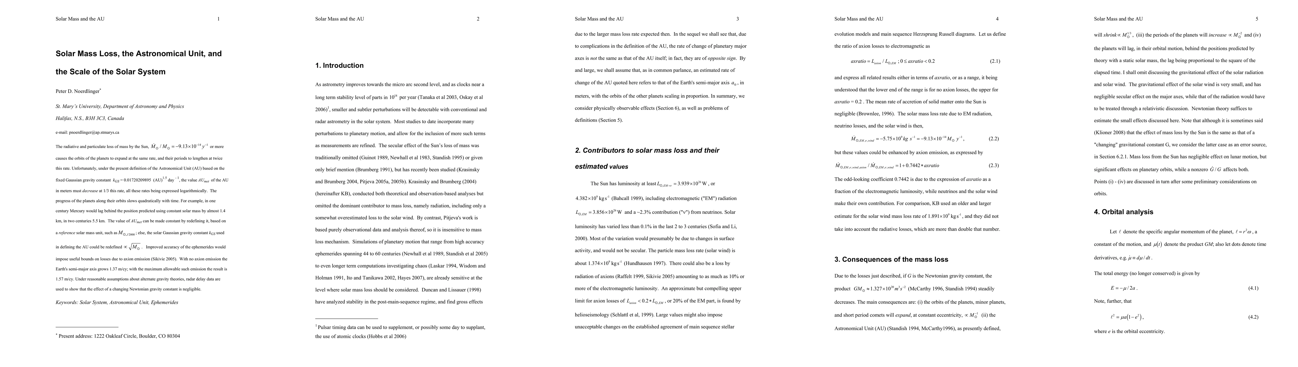 The paper discusses solar mass loss impacting planetary orbit expansion and period lengthening. It proposes redefining the Astronomical Unit (AU) to maintain constancy, considering solar mass changes. The study also explores axion emission effects and finds negligible influence of a changing Newtonian gravity constant on orbital dynamics.