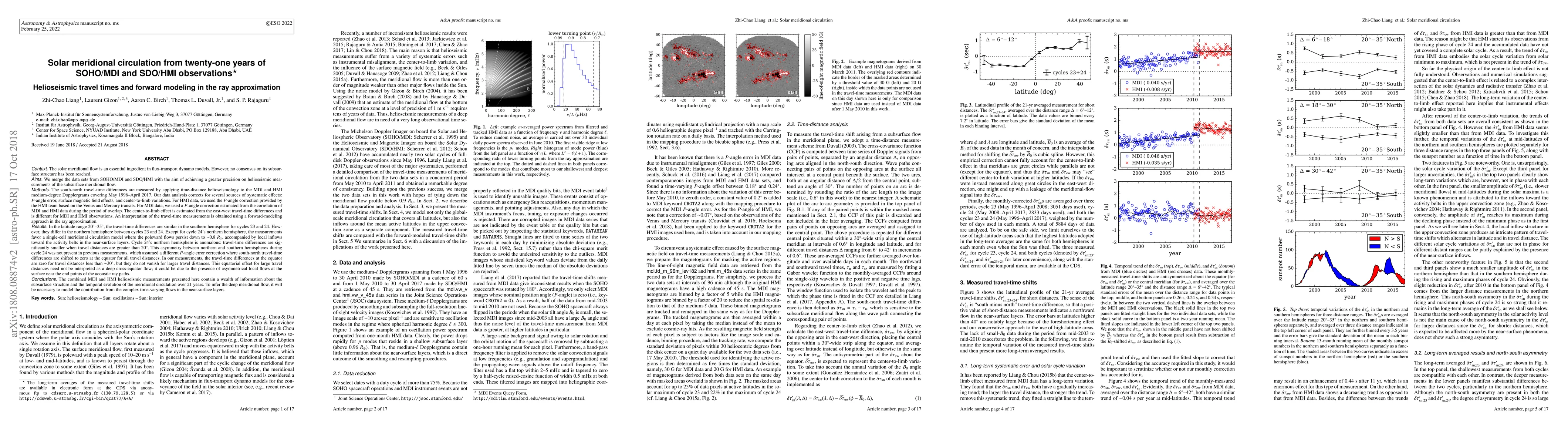This study analyzes 21 years of solar observations from SOHO/MDI and SDO/HMI to measure meridional circulation using helioseismic travel times, correcting for systematic effects. The findings suggest a single-cell meridional circulation model in the southern hemisphere, while the northern hemisphere shows anomalies during cycle 24, indicating a complex and asymmetric circulation pattern.