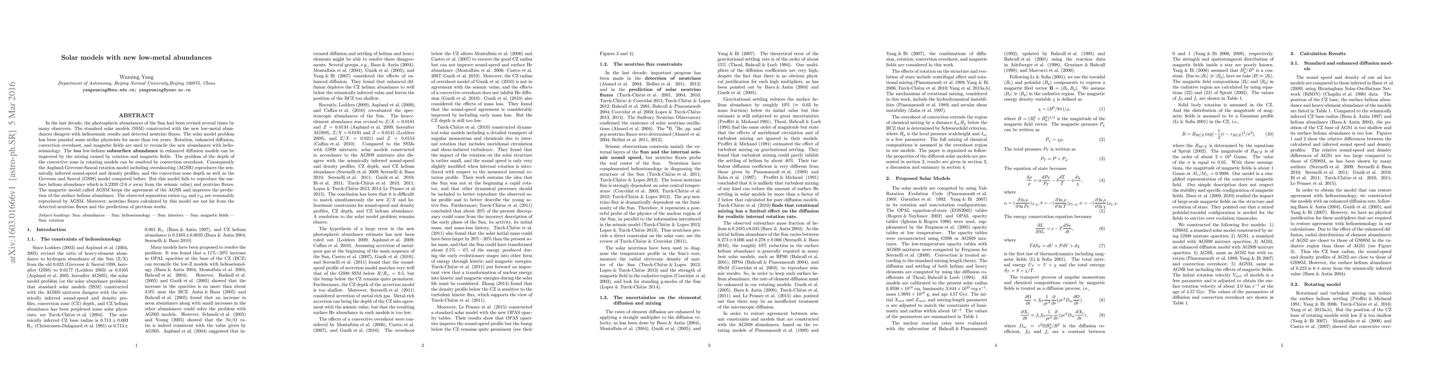 In the last decade, the photospheric abundances of the Sun had been revised several times by many observers. The standard solar models (SSM) constructed with the new low-metal abundances disagree with helioseismic results and detected neutrino fluxes. The solar model problem has been puzzled some stellar physicists for more than ten years. Rotation, enhanced diffusion, convection overshoot, and magnetic fields are used to reconcile the new abundances with helioseismology. The \textbf{too} low-helium \textbf{subsurface abundance} in enhanced diffusion models can be improved by the mixing caused by rotation and magnetic fields. The problem of the depth of the convective zone in rotating models can be resolved by convection overshoot. Consequently the Asplund-Grevesse-Sauval rotation model including overshooting (AGSR) reproduces the seismically inferred sound-speed and density profiles, and the convection zone depth as well as the Grevesse and Sauval (GS98) model computed before. But this model fails to reproduce the surface helium abundance which is 0.2393 ($2.6$ $\sigma$ away from the seismic value) and neutrino fluxes. The magnetic model called AGSM keeps the agreement of the AGSR and improves the prediction of the surface helium abundance. The observed separation ratios $r_{02}$ and $r_{13}$ are reasonably reproduced by AGSM. Moreover, neutrino fluxes calculated by this model are not far from the detected neutrino fluxes and the predictions of previous works.