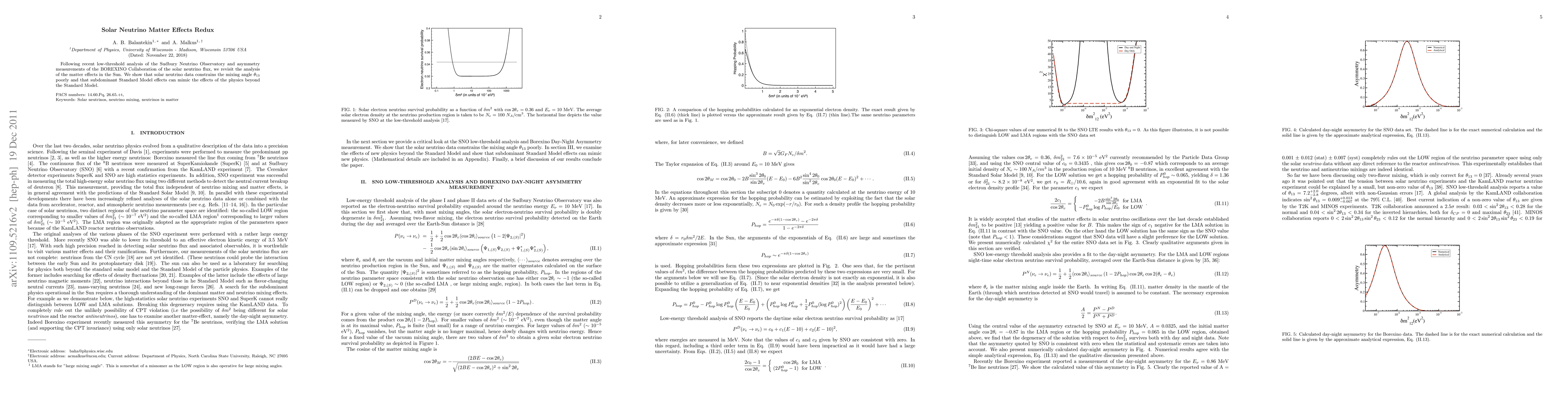 Following recent low-threshold analysis of the Sudbury Neutrino Observatory and asymmetry measurements of the BOREXINO Collaboration of the solar neutrino flux, we revisit the analysis of the matter effects in the Sun. We show that solar neutrino data constrains the mixing angle $\theta_{13}$ poorly and that subdominant Standard Model effects can mimic the effects of the physics beyond the Standard Model.
